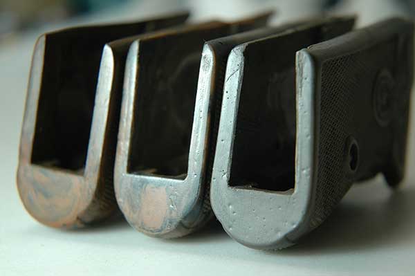一番左のオリジナルには、グリップ底の内側にコの字型の金属が鋳込んである。 材質も非常に硬い。