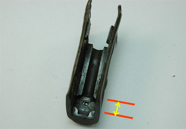 CMC のリコイルスプリングを支える部品のサイドを削った。そうしないと装着できない。もう少し削ってもいいくらいだが、面倒になってやめてしまった。 幅もほんの少しだけ削った。