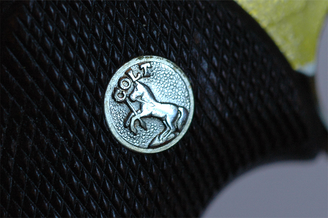 上の方の実銃で紹介したシリアル105番のメダリオンとは、ずいぶん違います。円の中で馬の占める割合が相当に大きいです。 尻尾が円に接しています。コルトの文字も極太なので、かなり古いデザインなのでしょうね。