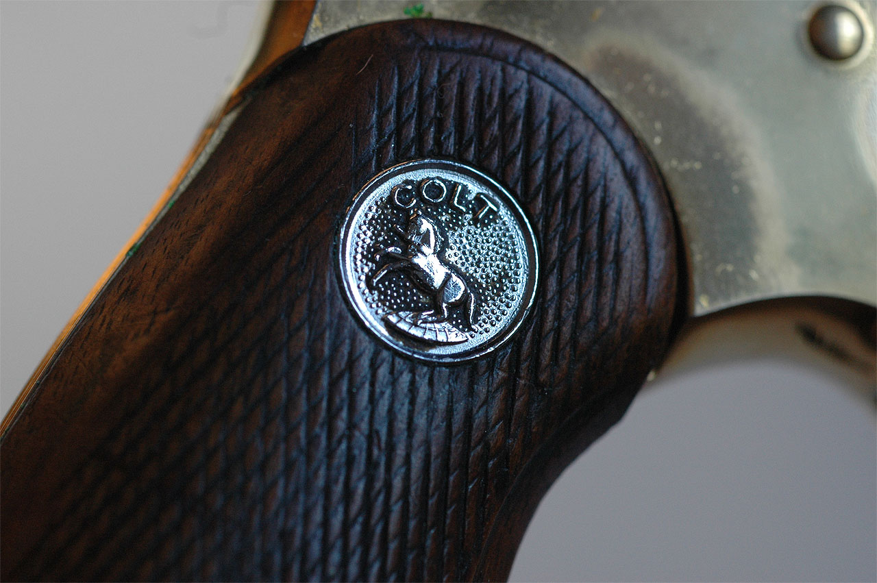これは、kingdam9-9 さん製作のカスタムモデルガンで1953年に発売された コルト357を再現しています。 フルチェッカー・グリップは前前オーナーにより前面が削られていますが、チェッカーはなかなか良い感じです。このグリップは、塗装されていません。 私の手にしたコルトのグリップには、ニスを塗った物と無塗装の物が存在しますが、おおむねオールド・フルチェッカーは無塗装のようです。