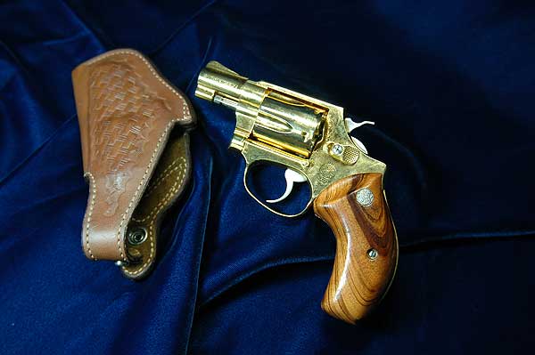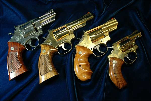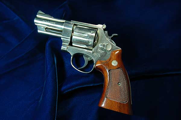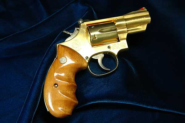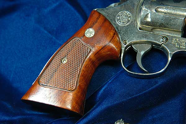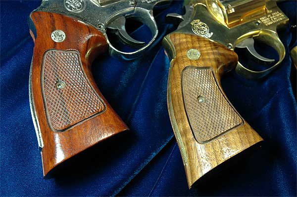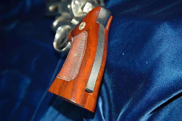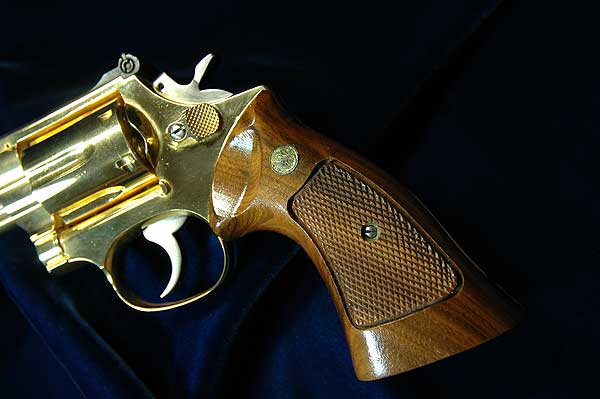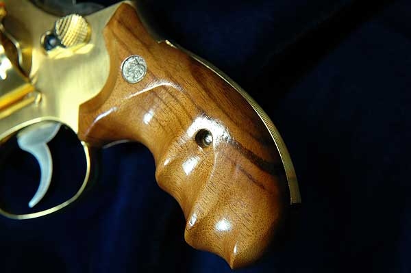 オールドタイプといってもダイヤモンドチェッカーでは無い。 スピードローダーの切り欠きが無いタイプだ。 S&W のグリップの色は、おおむねこのような黄色系であるが、下に出てくる赤系もあるのを最近知った。