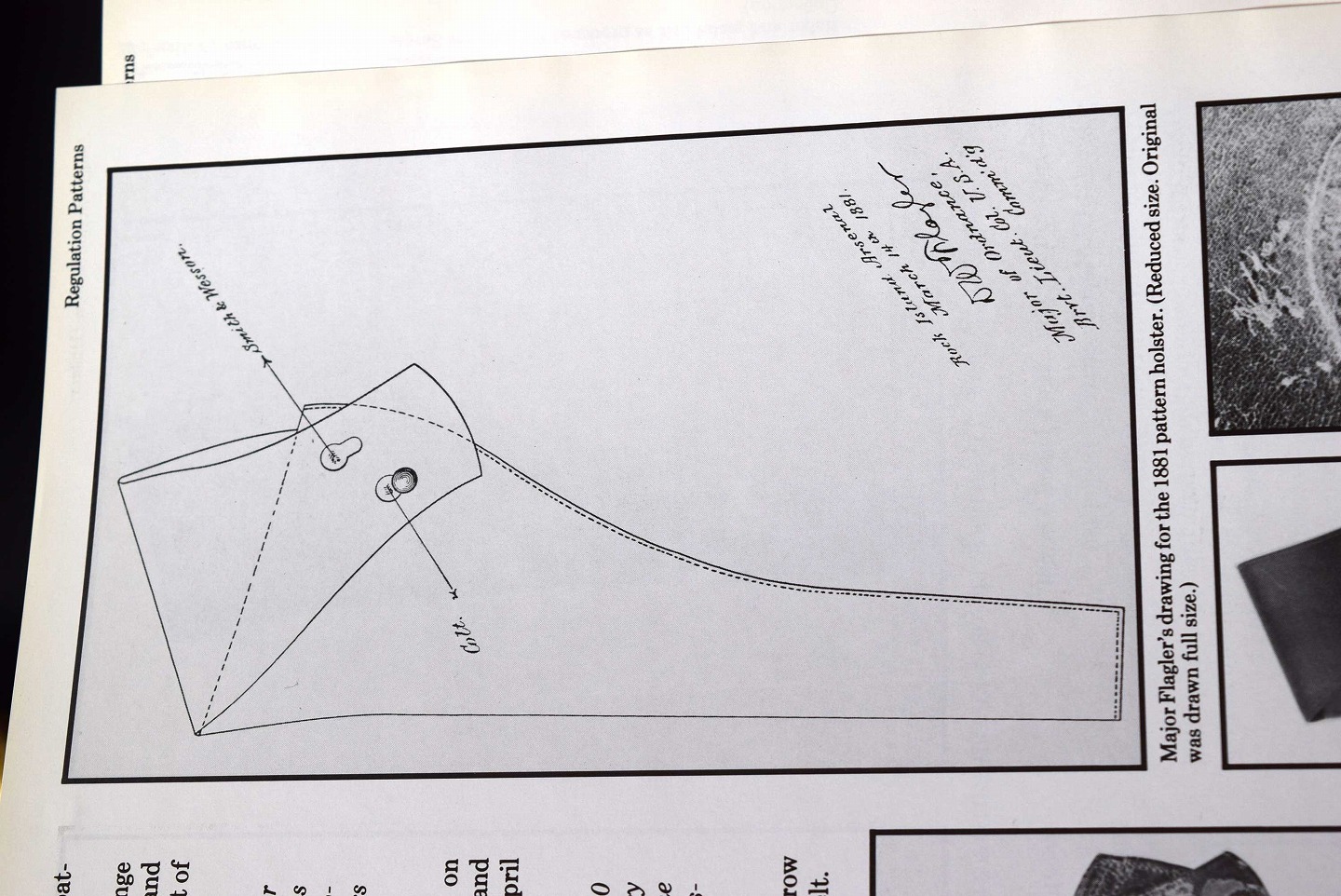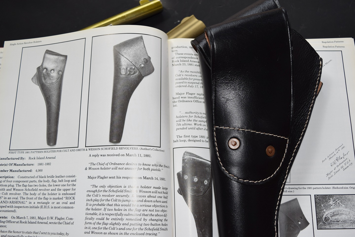 数年後にコルトのSAA も採用されましたので、このころはコルト、S&W 両者ともに米軍制式拳銃でした。 よってホルスターもどちらにも使えるようにとフラップのギボシ用の穴が2ヵ所開いていました。 それが1881ホルスターです。