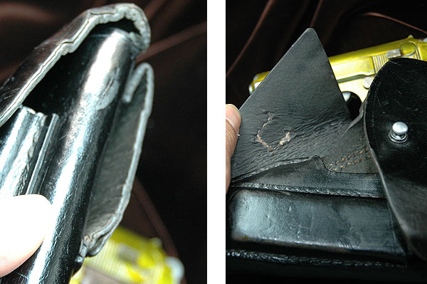 通常の牛革のホルスターは、左のようにフタの裏側は、そのまんまバックスキンである。 したがって1枚の革で作られている。