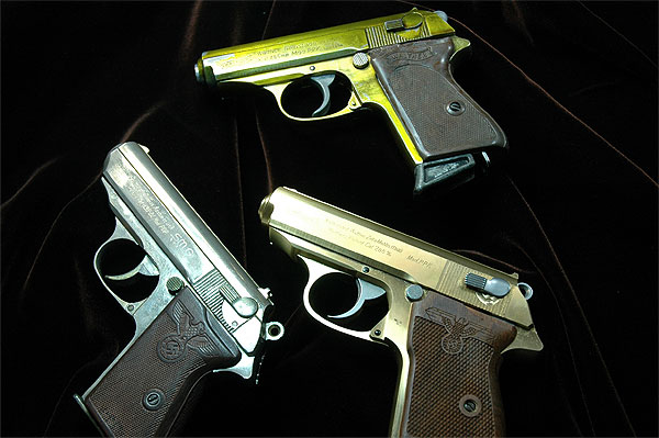今回登場した、お宝3個、記念撮影。 MGC のもののスライド先端下部の切込みがなだらかなのが、戦後版PPK のつくりである。