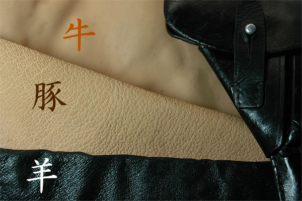 ついでに革質うんちく。上から牛革、豚、ひつじ革である。 このページでは、ひつじ革かもと書いたが、こうやって並べてみると違うようだ。 毛並みは牛みたい。通常牛の皮は厚くてこのホルスターの上貼りのように薄いものは無いので ひょっとすると馬の皮が使用されているのかもしれない。 その後、ガンモさんより「スペイン・ラム」の革では無いだろうかと意見を寄せてくれました。 実際は、よくは判りませんが良い革です。