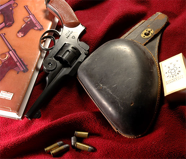 弾入れの最上段は8発。フランス・リボルバーのものは6発で11mm口径なので、でっかい。クリーニングロッド(さく杖)入れが付いている物は日本の26年式の証である。 ちなみに、クリーニングロッドはものすごくレアらしい。
