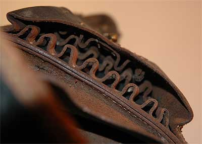 本当に100年物か? シリンダーの痕跡がまったくない。おそらく銃が入れられた事は無いのであろう。 クモの巣やゴミがいっぱい。 よく見ると木だと思い込んでいた内部スペーサーは厚い皮を3枚張り合わせたものだ。