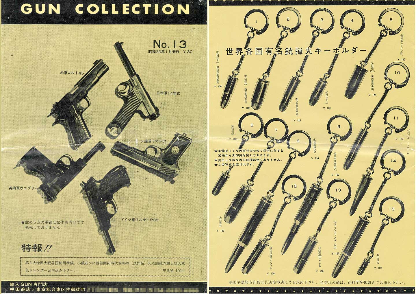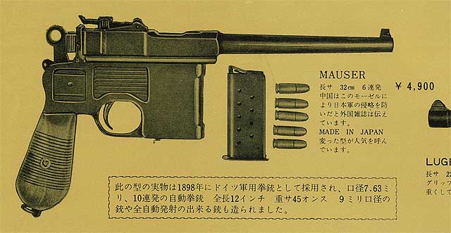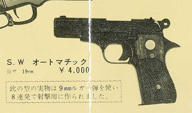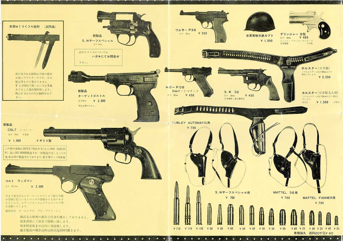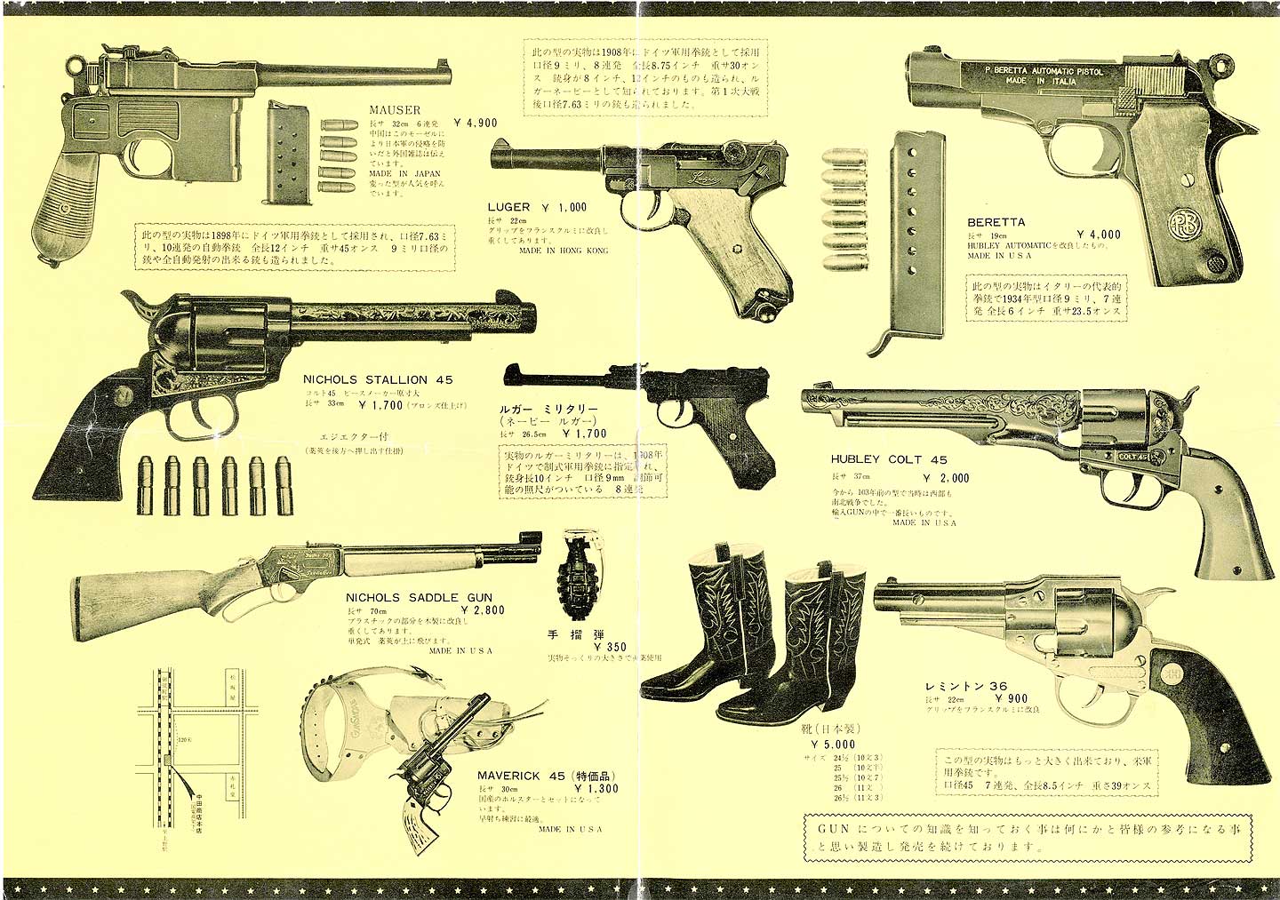 左上には国産初のオリジナル・モデルガンとなったホンリューのモーゼルが見られます(1962年登場)。ホンリュー無きあとは