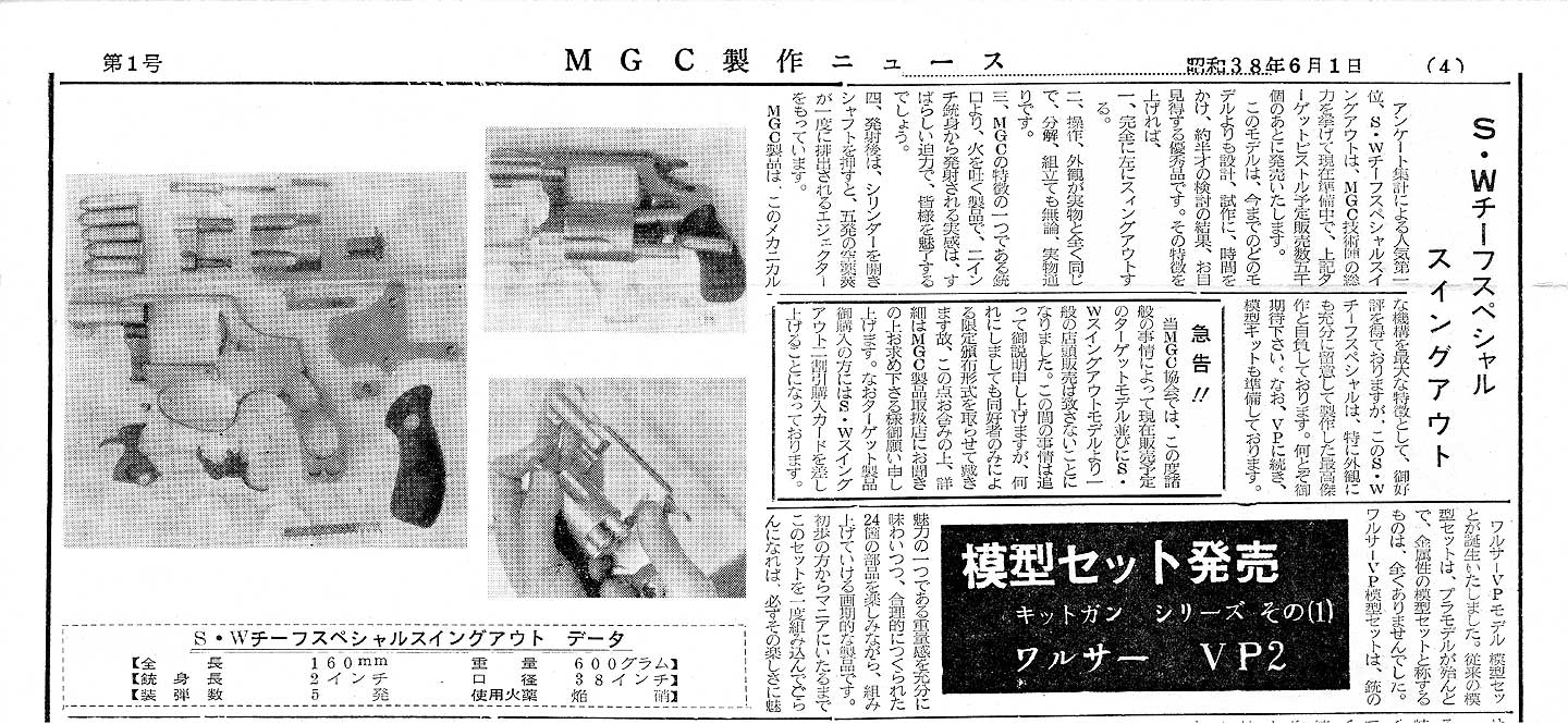 カタログ左側一番上のMGC のチーフは、発売直前でまだ価格などは間に合っていませんね。 日本初のスイングアウト式リボルバのモデルガンであり開発に遅れが見られるようです。 以下に資料を2点あげておきます。