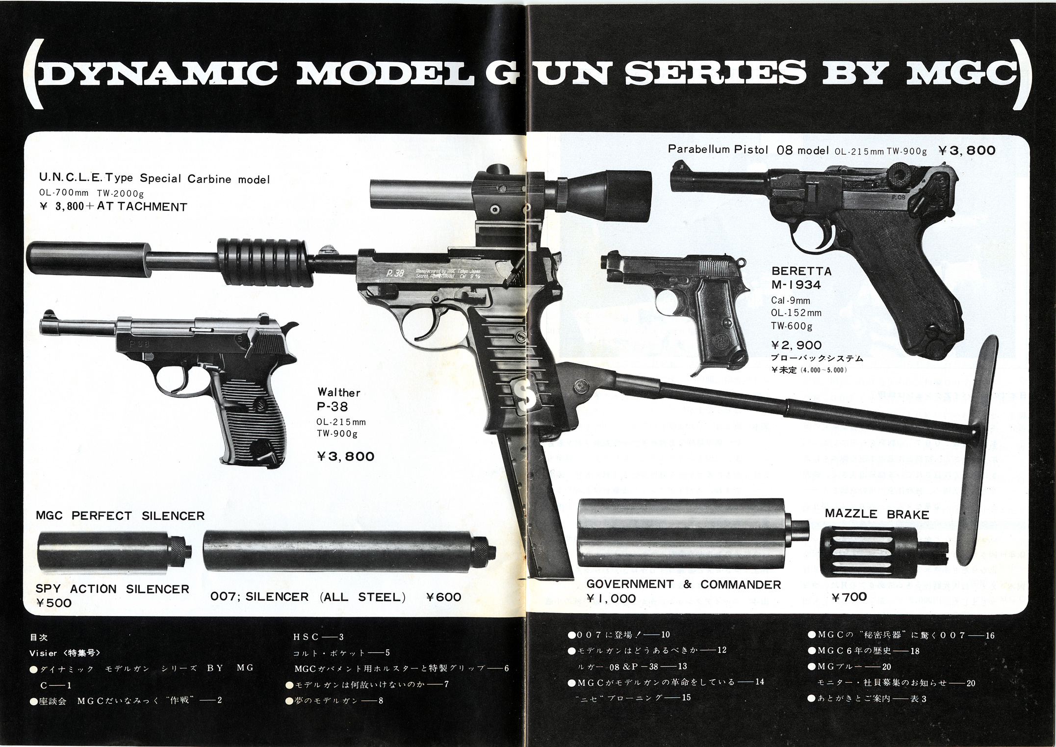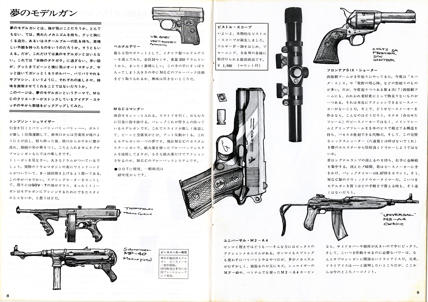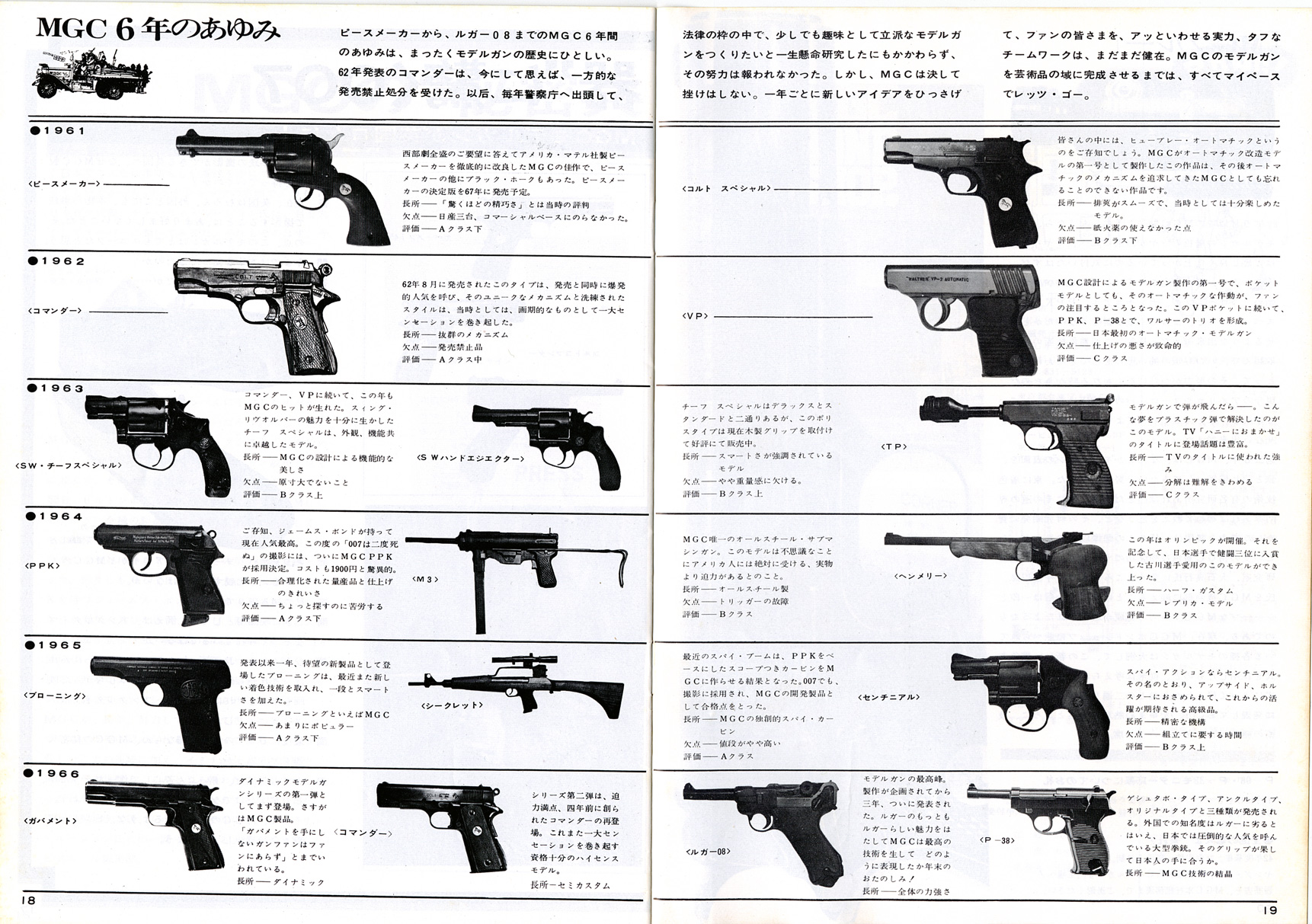 基礎知識1961年に貿易自由化され、大量にアメリカからキャップガンが輸入されました。中田商店によるものです。 それをコピーし改造し、よりリアルな物を製造しだしたのが神保氏のMGC でした。キャップガンとは違うんだという意気込みから、それらを「モデルガン」と呼びました。MGC 製品は、市場独占で日本製モデルガン=MGC 製という状況でした。 販売は、コクサイ、マルゴー、江原商店(CMC)、本流、マルホコルト(堀内商店)などで、MGC は販売はしていませんでした。 1965年、画期的新製品ブローニング380の発売に際し、MGC は、住民票の提出を義務付けます。 これは、発禁も食らったことのあるMGC がトイガンの将来を危惧してのことでした。伏線はこの年の実銃乱射事件による警察の一方的な 銃刀法改正が行われたことでしょう。社会に溢れるようになった モデルガンの行く末を案じたのだと思います。賛同しないと品物を卸さないという強硬姿勢でした。 ところが、販売店側はこれに猛反発、しかも直営店まで出すというMGC とは、完全に絶交状態になります。 反MGC 連合はコクサイの荒井新一郎氏を中心に打倒MGC を掲げ「高級玩具組合」を設立します。 MGC 製品がないと売るものがない組合側は、MGC 製品の丸ごとコピー品を許可なく製造販売し始め、ここに 15年にわたる「仁義なきモデルガン戦争」が始まったのでした。 1968年ビジェールは1967年印刷のようです。モデルガン戦争まっただ中の頃です。