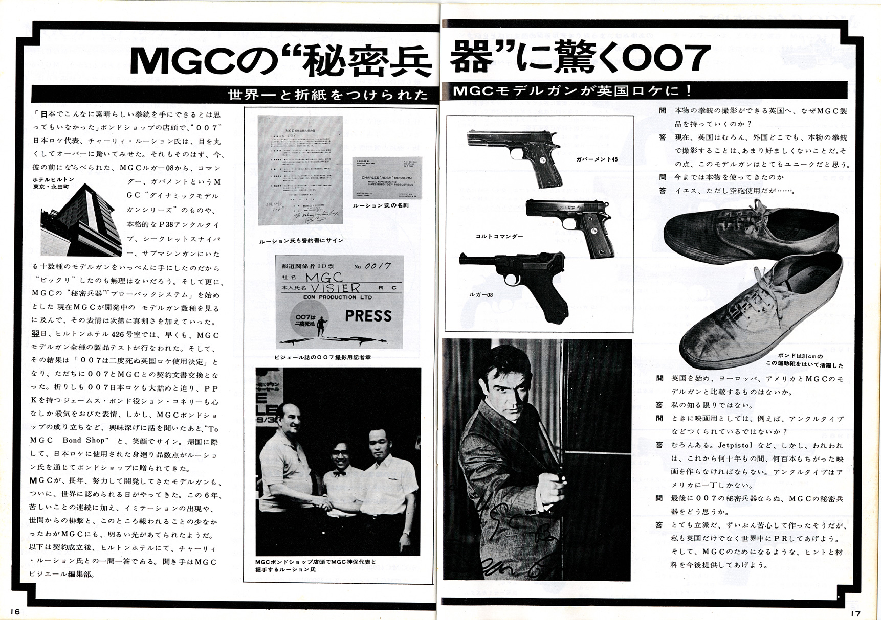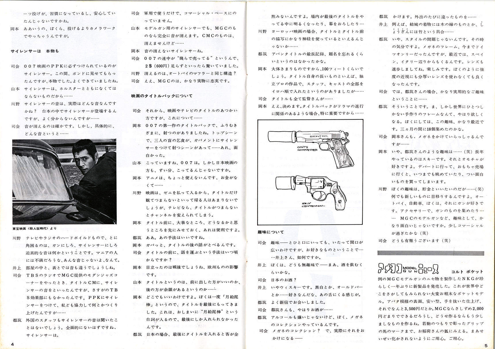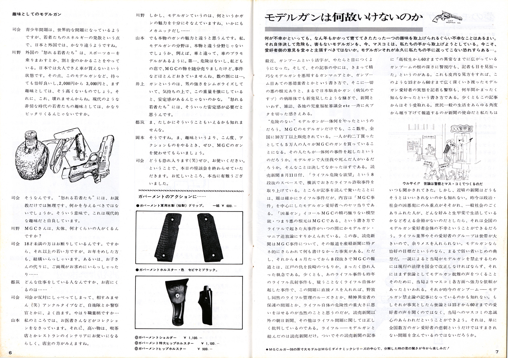 基礎知識1961年に貿易自由化され、大量にアメリカからキャップガンが輸入されました。中田商店によるものです。 それをコピーし改造し、よりリアルな物を製造しだしたのが神保氏のMGC でした。キャップガンとは違うんだという意気込みから、それらを「モデルガン」と呼びました。MGC 製品は、市場独占で日本製モデルガン=MGC 製という状況でした。 販売は、コクサイ、マルゴー、江原商店(CMC)、本流、マルホコルト(堀内商店)などで、MGC は販売はしていませんでした。 1965年、画期的新製品ブローニング380の発売に際し、MGC は、住民票の提出を義務付けます。 これは、発禁も食らったことのあるMGC がトイガンの将来を危惧してのことでした。伏線はこの年の実銃乱射事件による警察の一方的な 銃刀法改正が行われたことでしょう。社会に溢れるようになった モデルガンの行く末を案じたのだと思います。賛同しないと品物を卸さないという強硬姿勢でした。 ところが、販売店側はこれに猛反発、しかも直営店まで出すというMGC とは、完全に絶交状態になります。 反MGC 連合はコクサイの荒井新一郎氏を中心に打倒MGC を掲げ「高級玩具組合」を設立します。 MGC 製品がないと売るものがない組合側は、MGC 製品の丸ごとコピー品を許可なく製造販売し始め、ここに 15年にわたる「仁義なきモデルガン戦争」が始まったのでした。 1968年ビジェールは1967年印刷のようです。モデルガン戦争まっただ中の頃です。