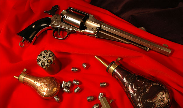 写真小道具のフラスコは、黒色火薬入れでレバーを開けると火薬をシリンダーに入れることが出来る。 犬の模様はレミントン用である。写真の物はイタリア製レプリカ。私のページの「海外買物」に記述してある。 20ドルくらいと送料でアメリカから購入できる。