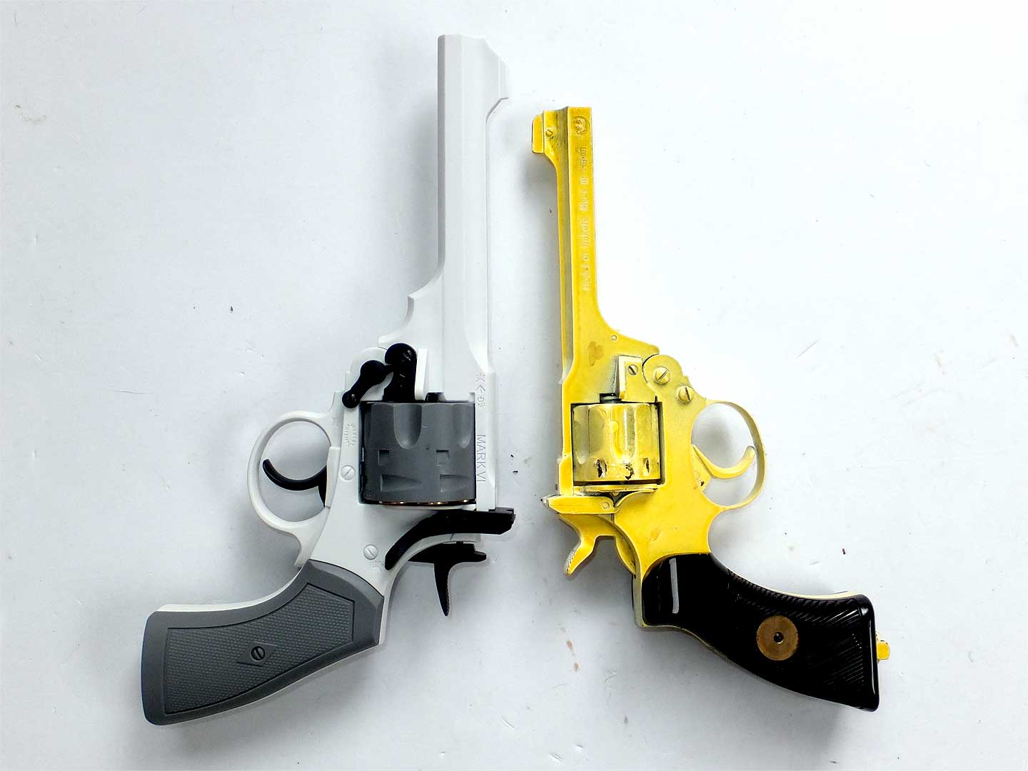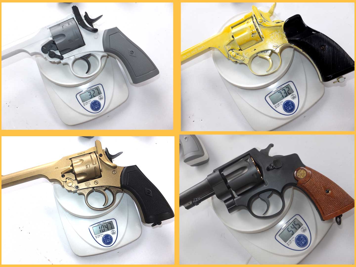 ガスガンは、バレルを鉛で埋めているので、より重くなっています。タナカのプラ製モデルガンは、カート込みです。