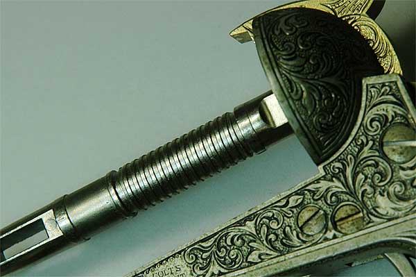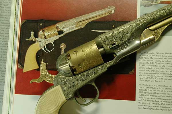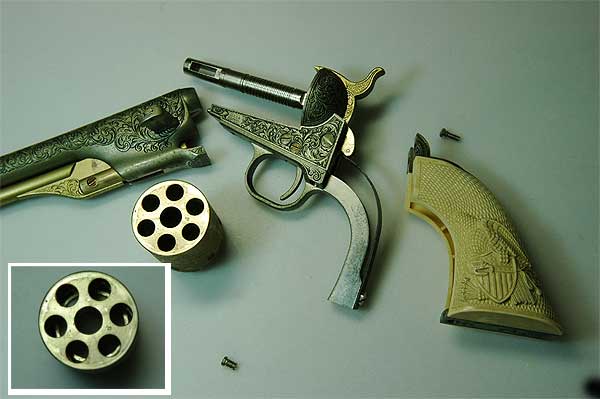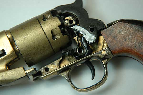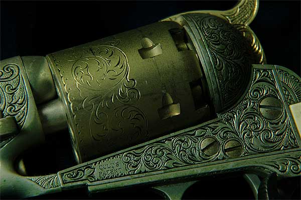 実銃の世界では、1851年の36口径ネービーが大ヒットしたコルト社はその後ドラグーンを製造し、1860年に44口径のアーミーを発売。南北戦争に遭遇し銃は売れまくったことだろう。そのせいか知らないが、創業者サミュエル・コルト氏は1862年働きすぎて亡くなった。 |