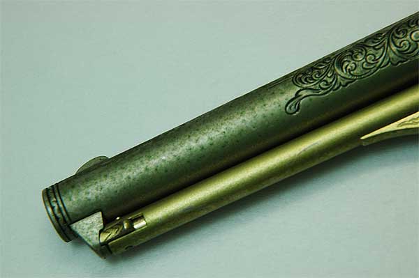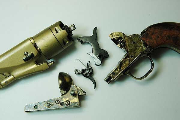 1851ネービーと比べると流線型を使用し少しでも銃を軽くしようとした事が判る。 シリンダーも後方部分は肉厚を減らしている。真ん中の36口径は肉厚は変わらない。