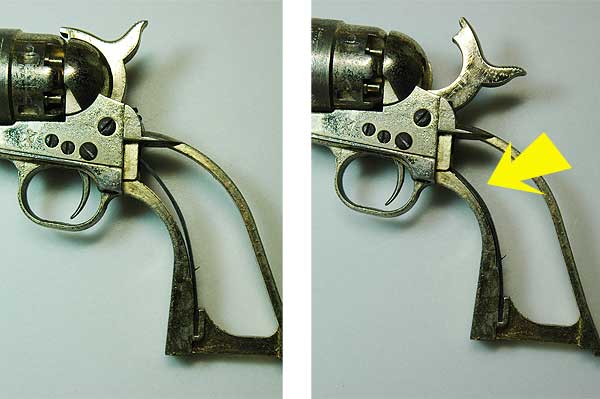 フルコック出来ない。右写真のようにフレームにバネがぴったりと当たってしまい、ハンマーがそれ以上起こせないのだ。あと少しのところなのだが・・・。板バネ形状に問題がありそうだ。 また、この写真のようにフレームはオリジナルとはずいぶん違う形だ。 実銃だったら折れそうである。貧弱な印象がする。 |