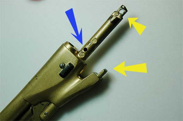 バレルは、けっこうグラついている。黄色の矢印の2点でフレームと接しているのでここにゴムなどを挟むと良くなる。 また、シリンダーをはずすとグラつき防止の小さなスプリングが青い矢印の穴から勢いよく飛び出してくるので紛失しないよう注意が必要だ。 このモデルガンは、たいへんに組み立てにくい。フレームプレートを乗せたときにトリガースプリングがハンドの裏側から外れてしまう。テンションがかかったままでフレーム留めねじを差し込むのは容易ではない。 しかし、何度もやっているとコツが判って来た。左手で持って組み立てたり、平らな机で組み立てていたらいつまで経っても組みあがらないが、布団の上に置いて組み立てると、いとも簡単に組みあがる。 これは銃のセンターラインがピッシリと出るためで、すべてのパーツがあるべき位置にきちんとおさまる。お試しあれ。 |