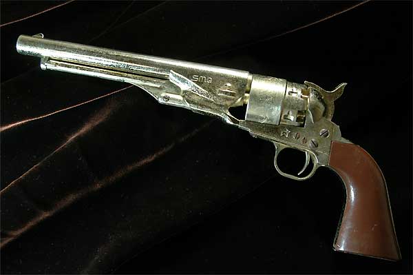 当時のモデルガン業界では、前装式のモデルはMGC の51ネービー、CMC のレミントンくらいであったが、何を思ったのかオリジナルで登場したマルシンの60アーミー。 MGC の猿まねが横行するモデルガン業界にあって貴重なモデルアップだったと思う。 しかし、作りはかなり貧弱だ。シリンダーの彫刻など素晴らしいのに残念だ。 |