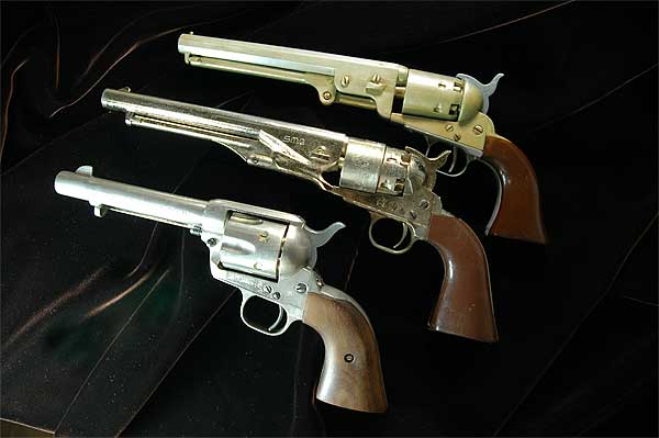 コルト社のヒット商品をモデルガンで再現してみた。 時代順に上から36口径51ネービー、44口径60アーミー、45口径SAA である。 全体のラインは、よく継承されている。ということは、一番初めのデザインが、すごく優秀だったことがわかる。こうやって見るとSAA が、かなりでっかくて丈夫に見える。 |