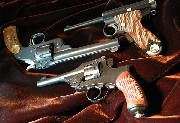 同じく六研製の26年式、南部式と並べてみた。 陸軍では、自国で拳銃も作れないのかという声に 押されて国産初の26年式拳銃が制式化された。明治後半にかけて壱番型から26年式に 随時変更されていった。 (陸軍でも壱番型は使用されていたようだ。下記別項)