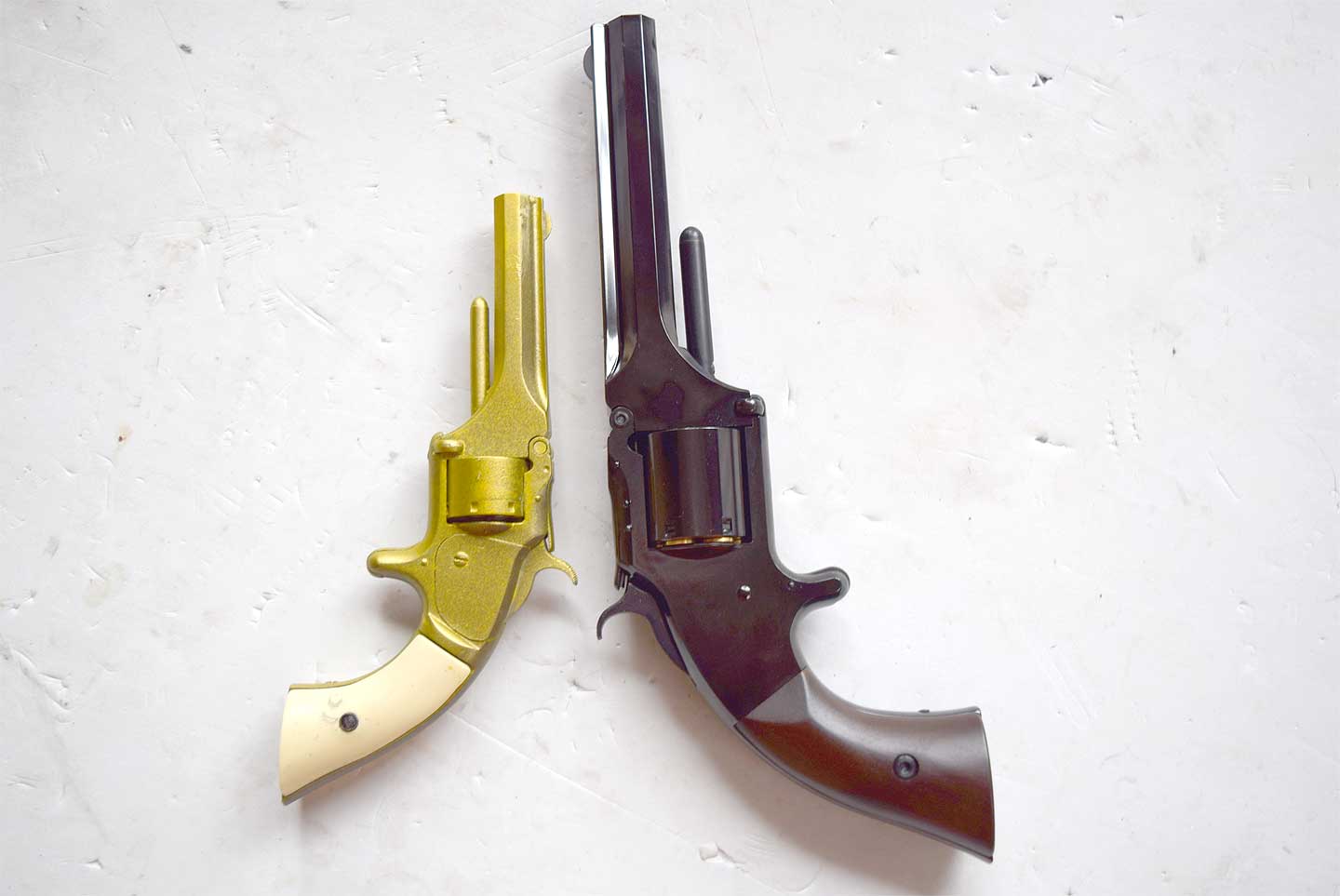 実銃ではNo.2 の9年後にトップブレイクというフレーム上端が開く形式のNo.3 が発明されました。 上の写真に登場のN0.3 はスペイン・デニックスのモデルガンです。一番右の写真は大きさ参考にCMC のM29 と並べています。