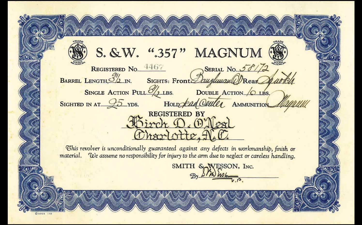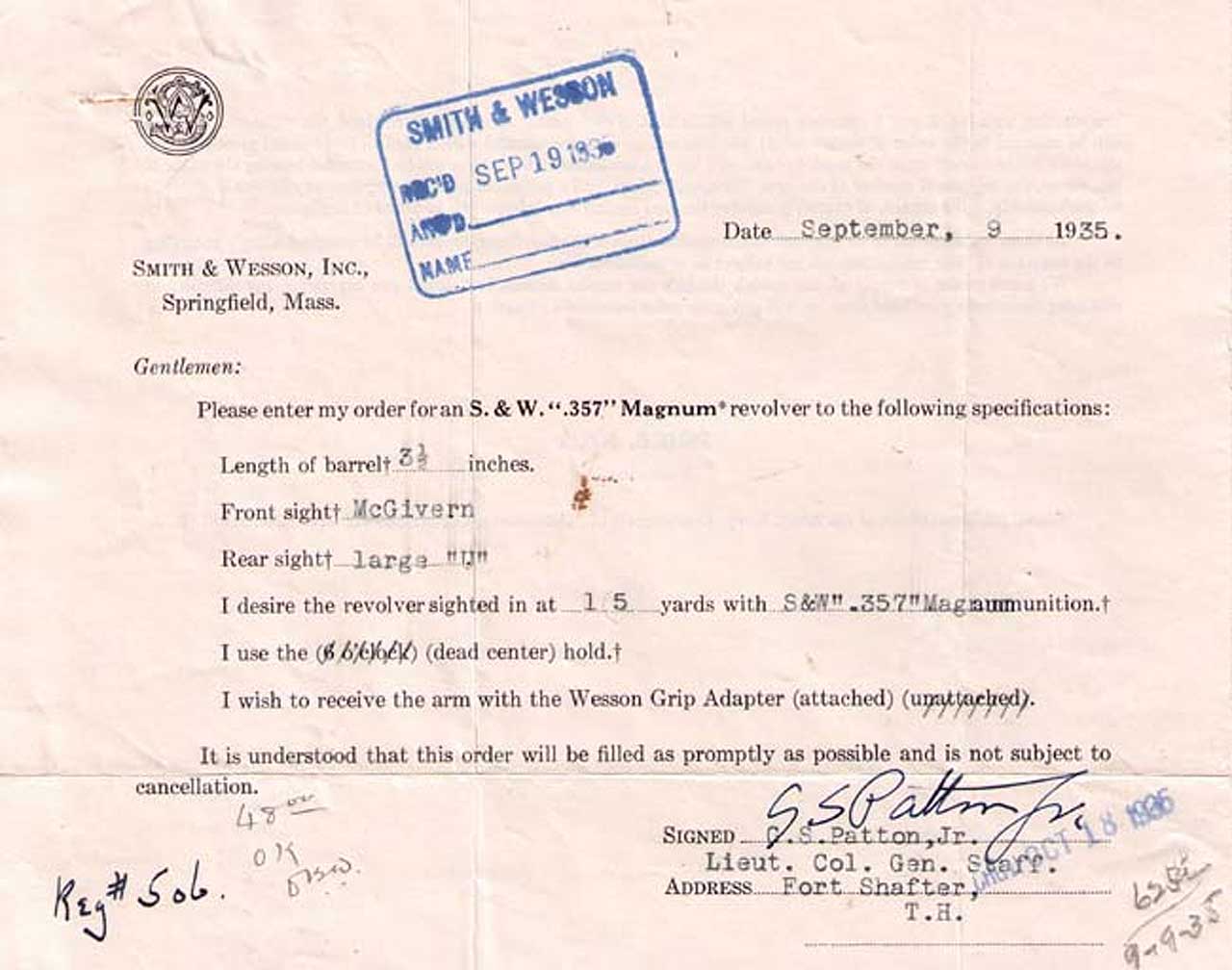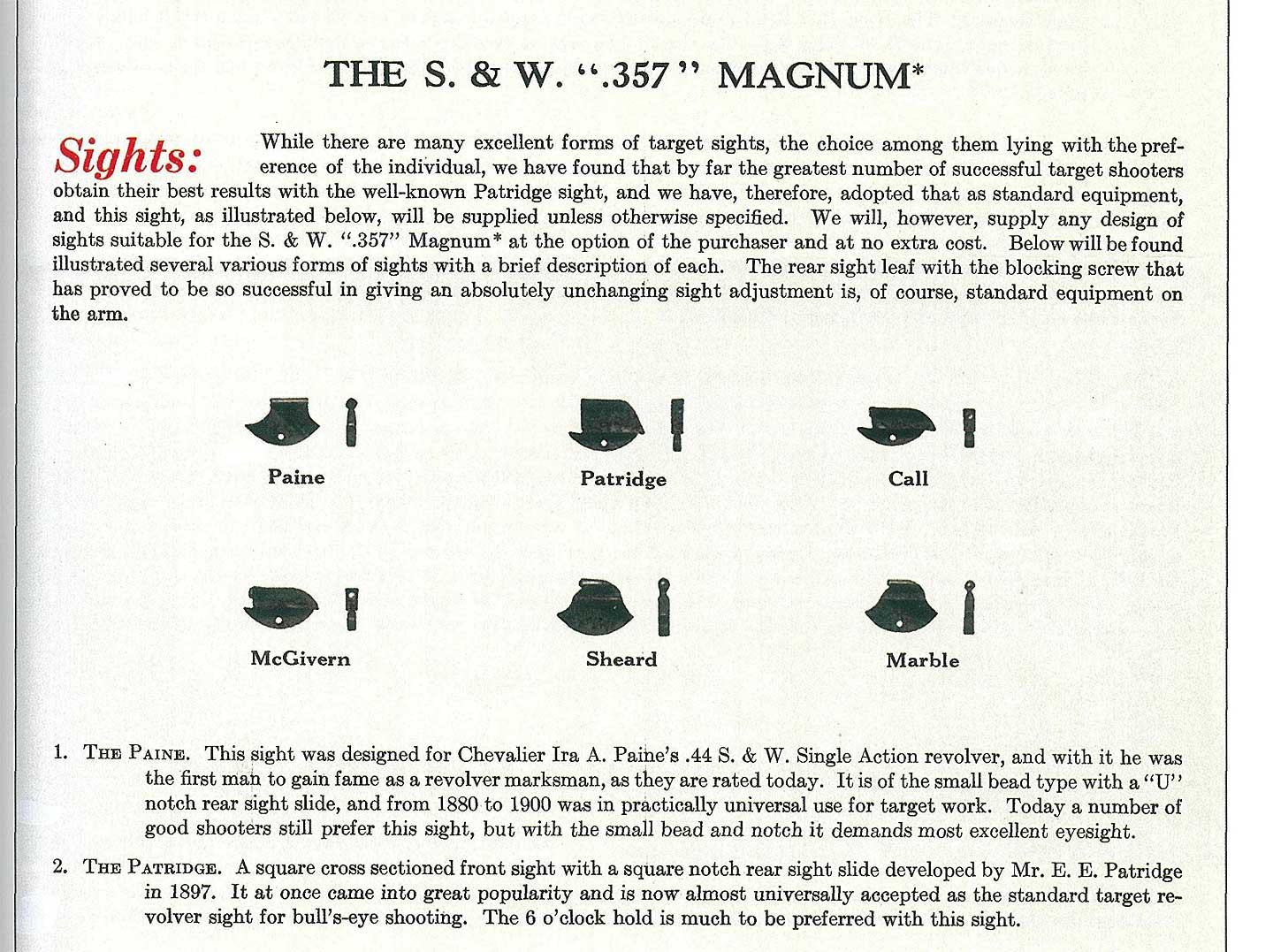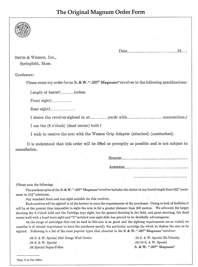 357マグナムは、もともと特別な弾で普通の人には関係ない領域であったため、それを発射する銃も特別あつらえでした。 1935年に「ザ・S&W 357マグナム」と弾と同じ名前で発売されたその銃は、バレル長など注文どうりに製作され、個別の登録証が付いてきたため、コレクターからレジスタード・マグナムと呼ばれました。 こちら、 登録証 です。レジスタード・ナンバーとシリアル・ナンバーは別のものです。こちら パットン将軍の仕様書 ですが、フロントサイトはマクギバン型となっています。そう、伝説の早撃ちおじさんエド・マクギバンさんです。またパットンの銃は近距離戦闘用にサイトは15ヤードに合わせています。このようにいろいろ選択できたのです。 こちら いろいろ選択できるカタログ の一部です。