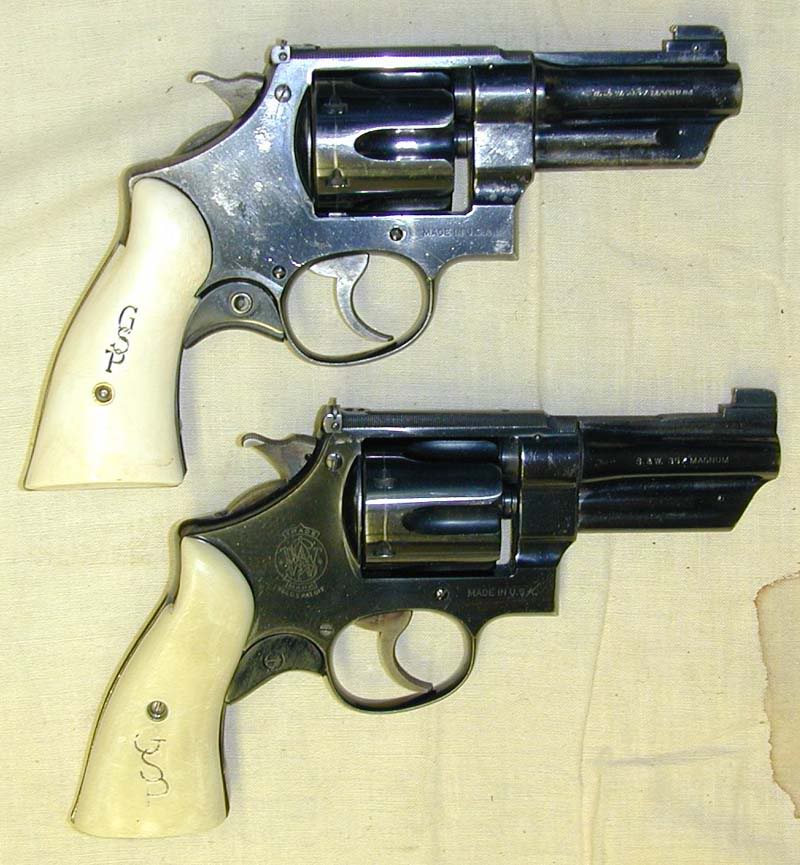 これは パットン将軍のレジスタード・マグナム ですが、上が本物で下が映画用プロップです。 見分けるのは簡単で、わがままなパットン将軍は自分のイニシアルをグリップの真ん中に刻ませています。 なので本物はグリップスクリューの位置が下方へと変えられています。