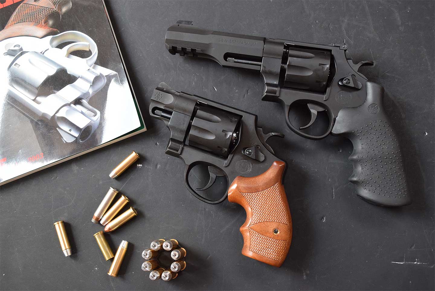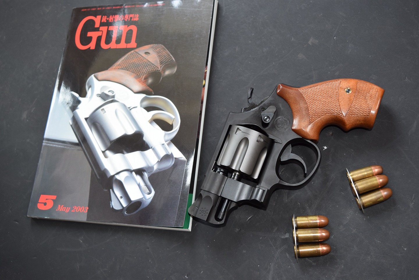 何がおかしいかというと、357マグナムの銃なのに45ACP がクリップ付きで置いてある。8連発なのにシリンダーのノッチが 6連発用だ。しかしGun 誌 の表紙にはそっくりである。このあたりがおかしなところです。