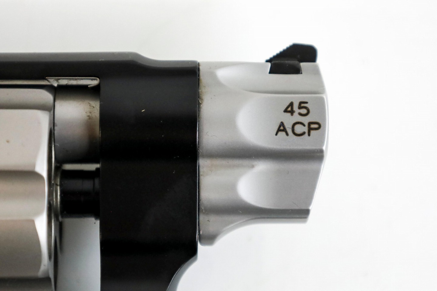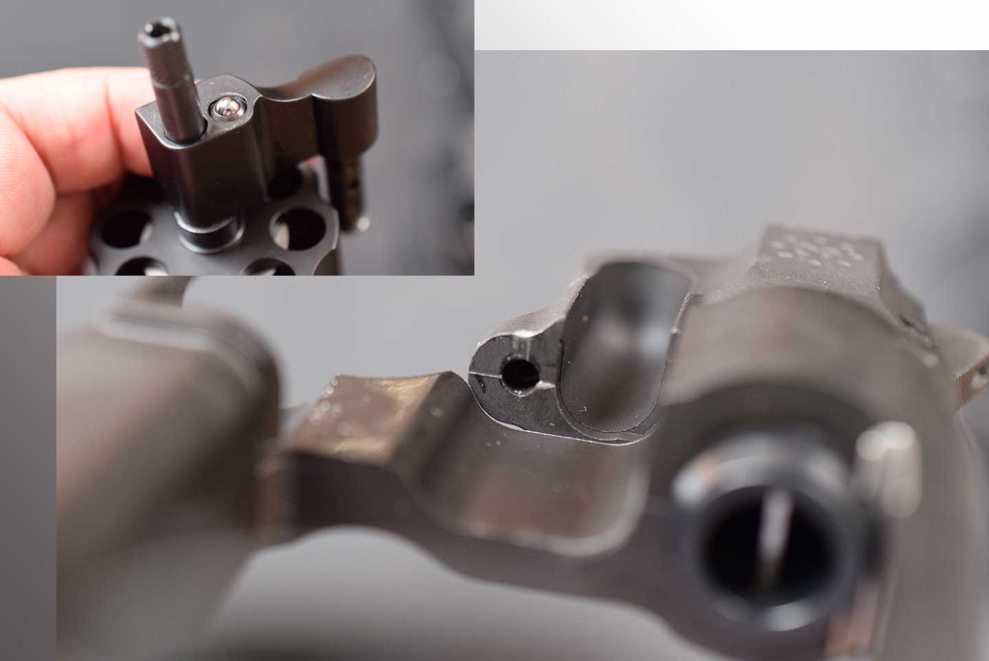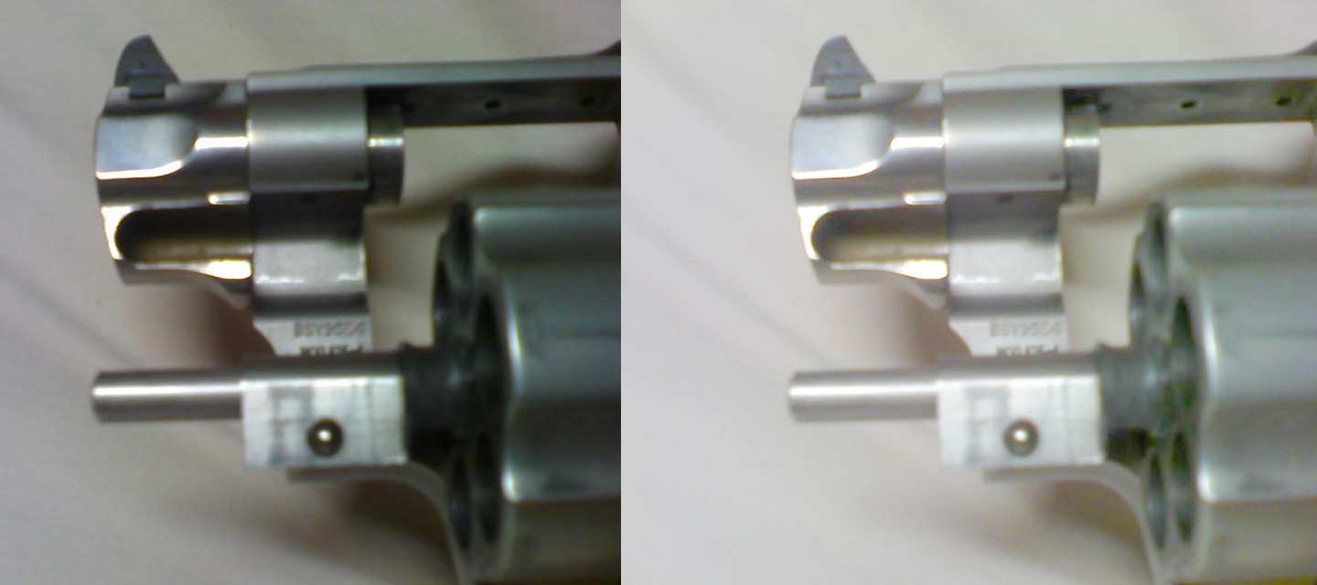 357マグナムより短い弾用のシリンダーなのでフォーシングコーン部には、すき間ができています。