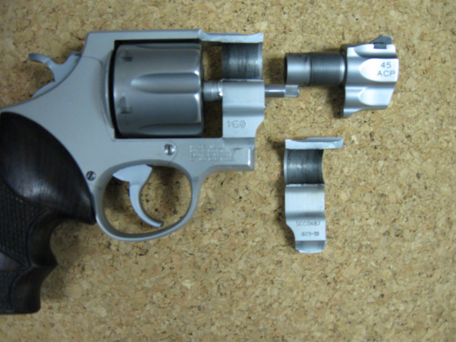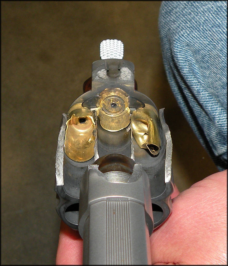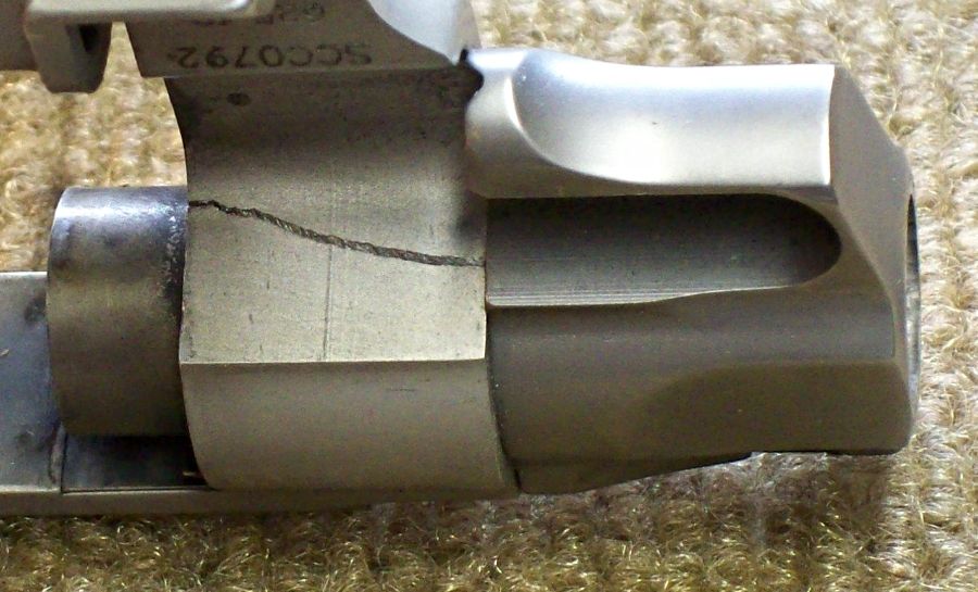 ネットフォーラムを見ていると、625−10の初期製品には、バレルの締めすぎによるクラック発生の欠陥による 破壊が見られます。S&W 社では修理せずに他の銃を推薦したようです。