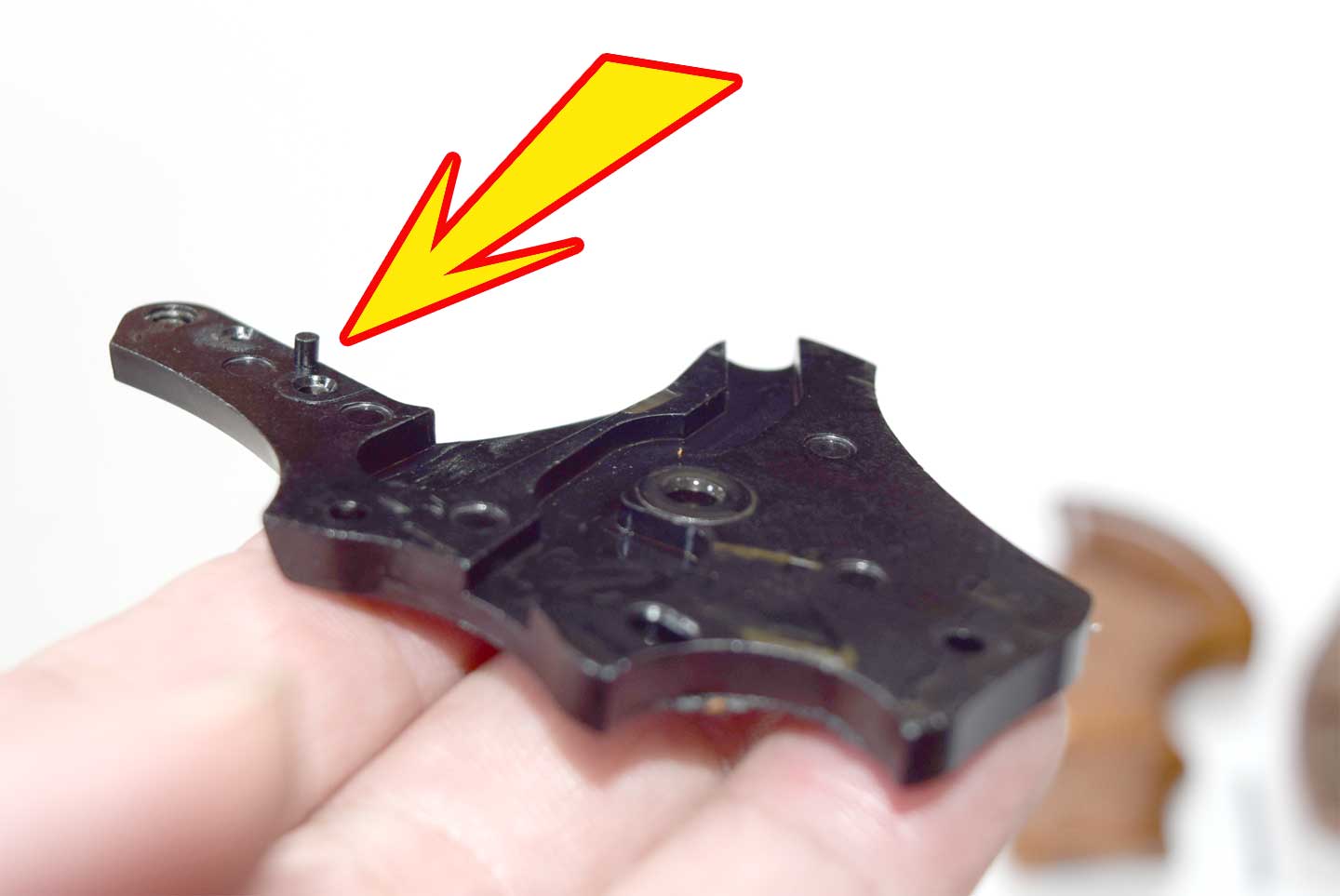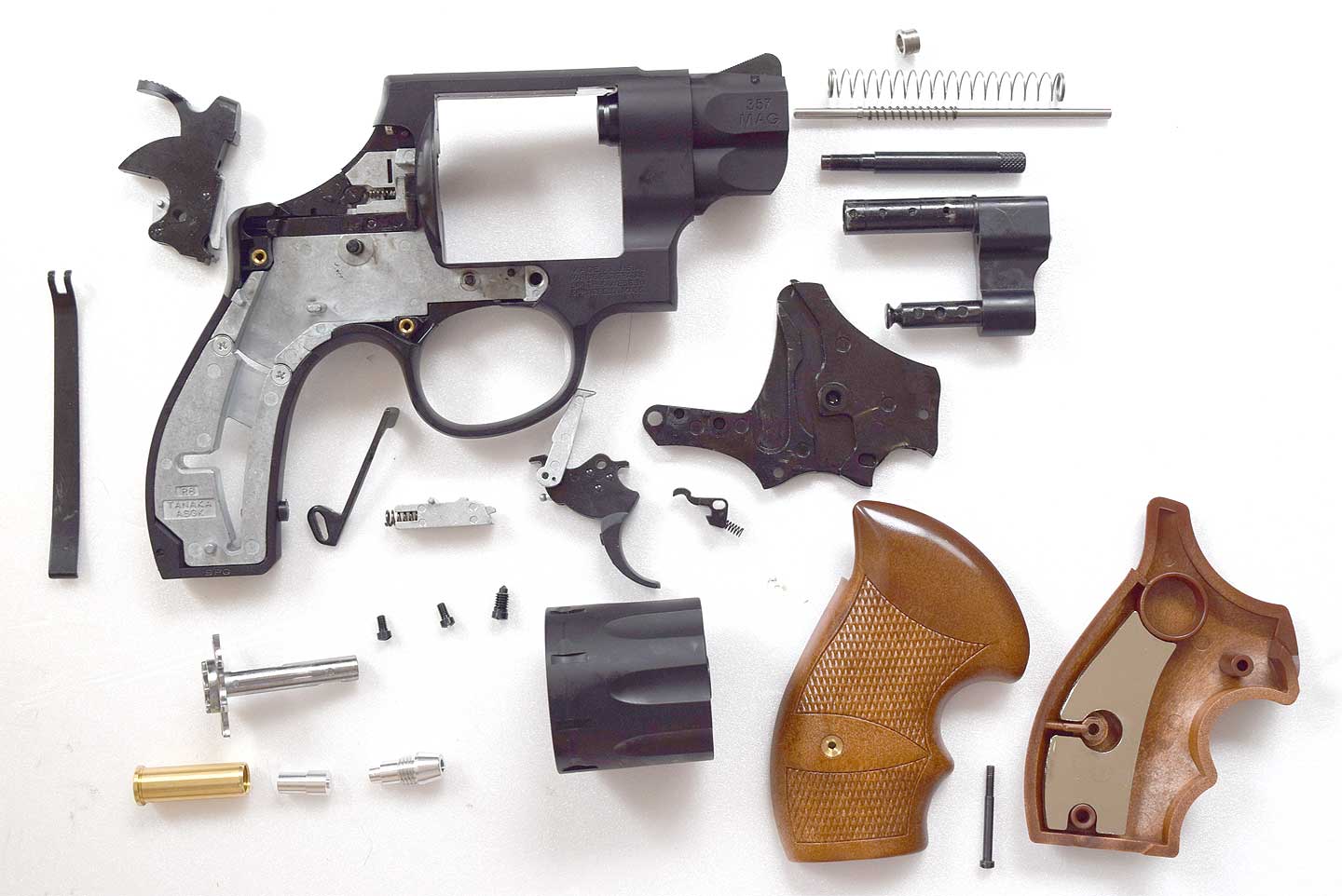 真ん中写真のタナカさんのトリガーストップスクリューは、形だけのものでした。右写真のサイドプレートのピンですが、実物には存在しないのですが、このピンのおかげでサイドプレートがさっさと組み立てられるようで、なかなか良いのではないでしょうか?