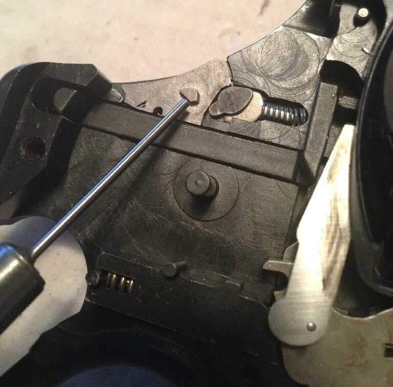 左写真は他の人の youtube から、44マグナムのボルトブロック機構を示していますが、タナカさんの327モデルガンでは