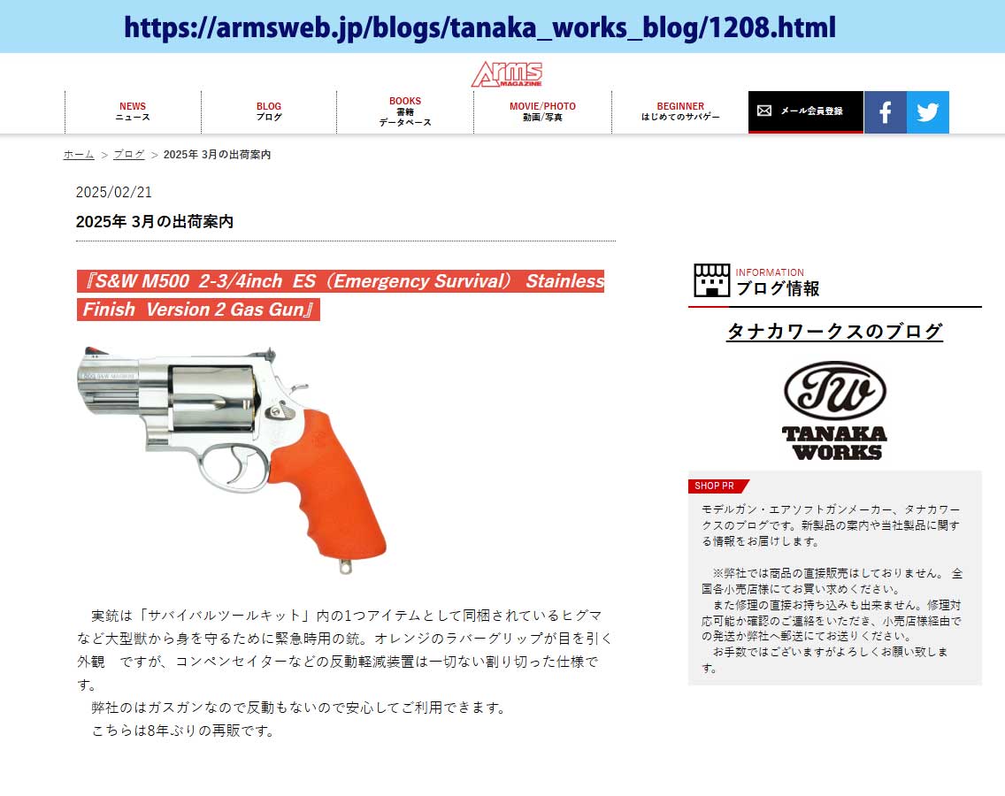 2025年2月ごろに福岡MGC のページでタナカさんの来月製品でSW500 ES が発売されることを知りました。