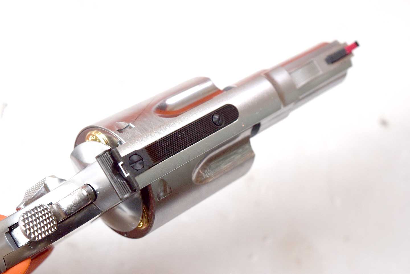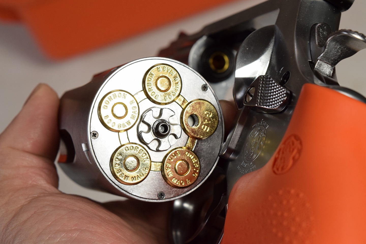 本物のステンレスの仕上げは、美しいです。素晴らしくって発火するのがもったいないです。 そういえば長い銃身のSW 500 を撃つ動画はよく見ますが、この短いやつは見かけませんね。 持っているだけで有難いモデルなのかもしれません。