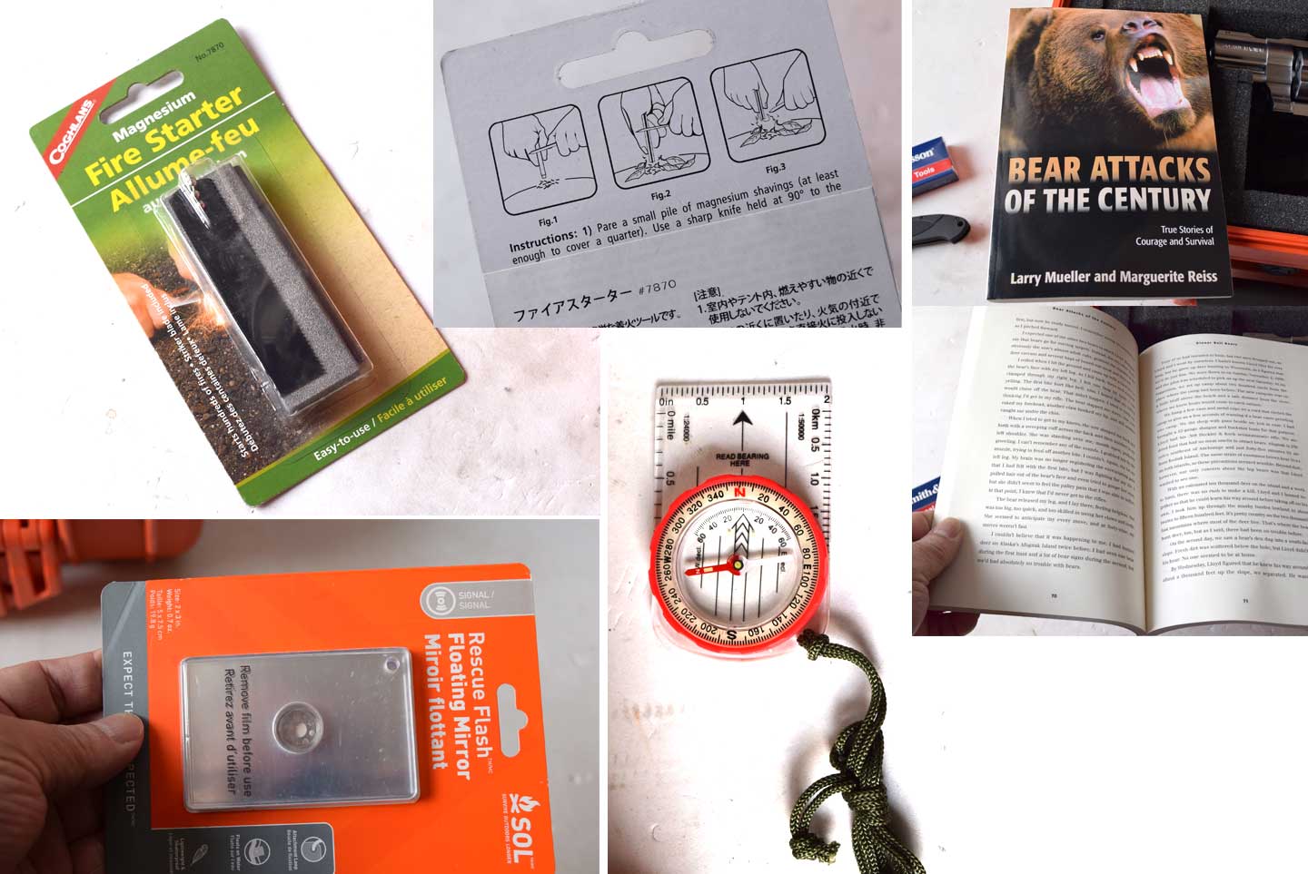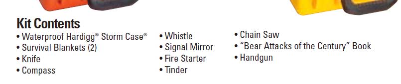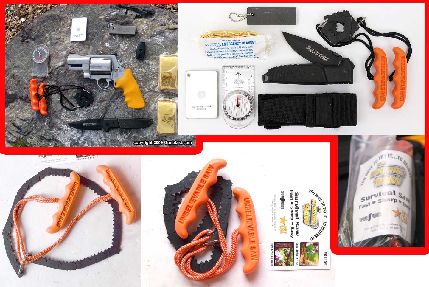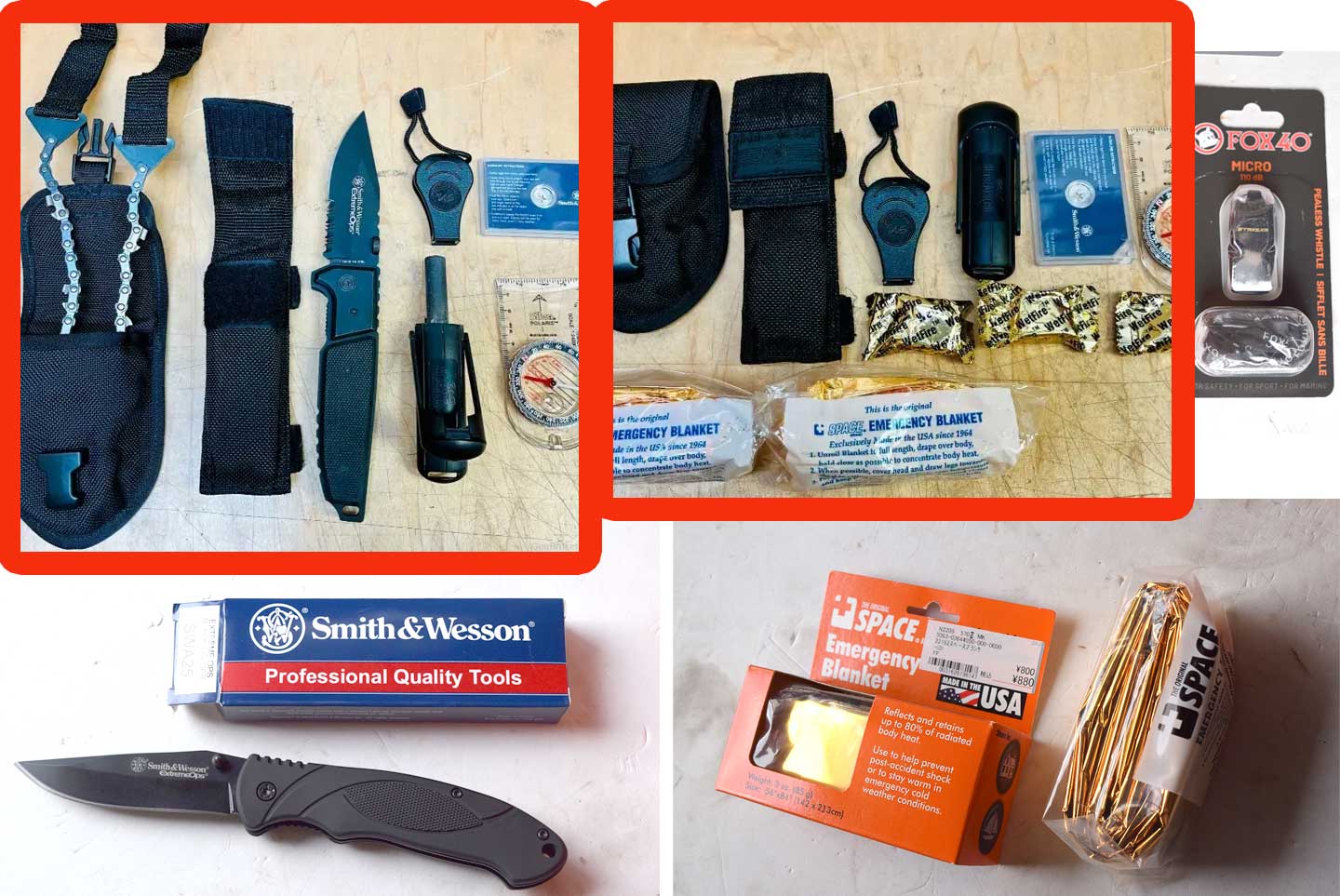 上写真の赤く囲んでいるものが実物の写真で、他は私が似たようなものを揃えたものです。 一枚目は、S&W のファースト・バージョンの品々でこの赤い柄のついたチェーンソーは セカンドバージョンから変わります。また、ファイアスターターも変わります。