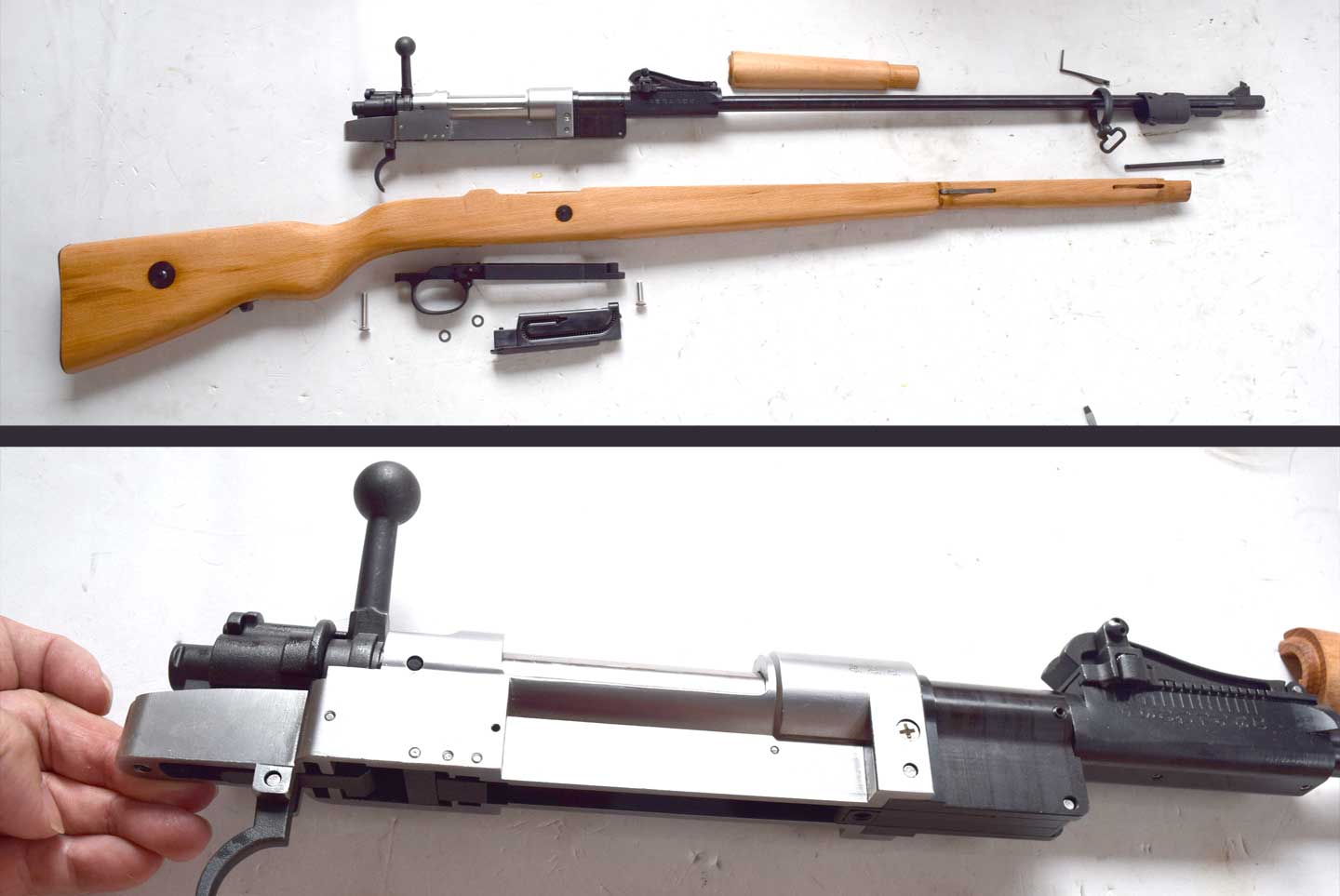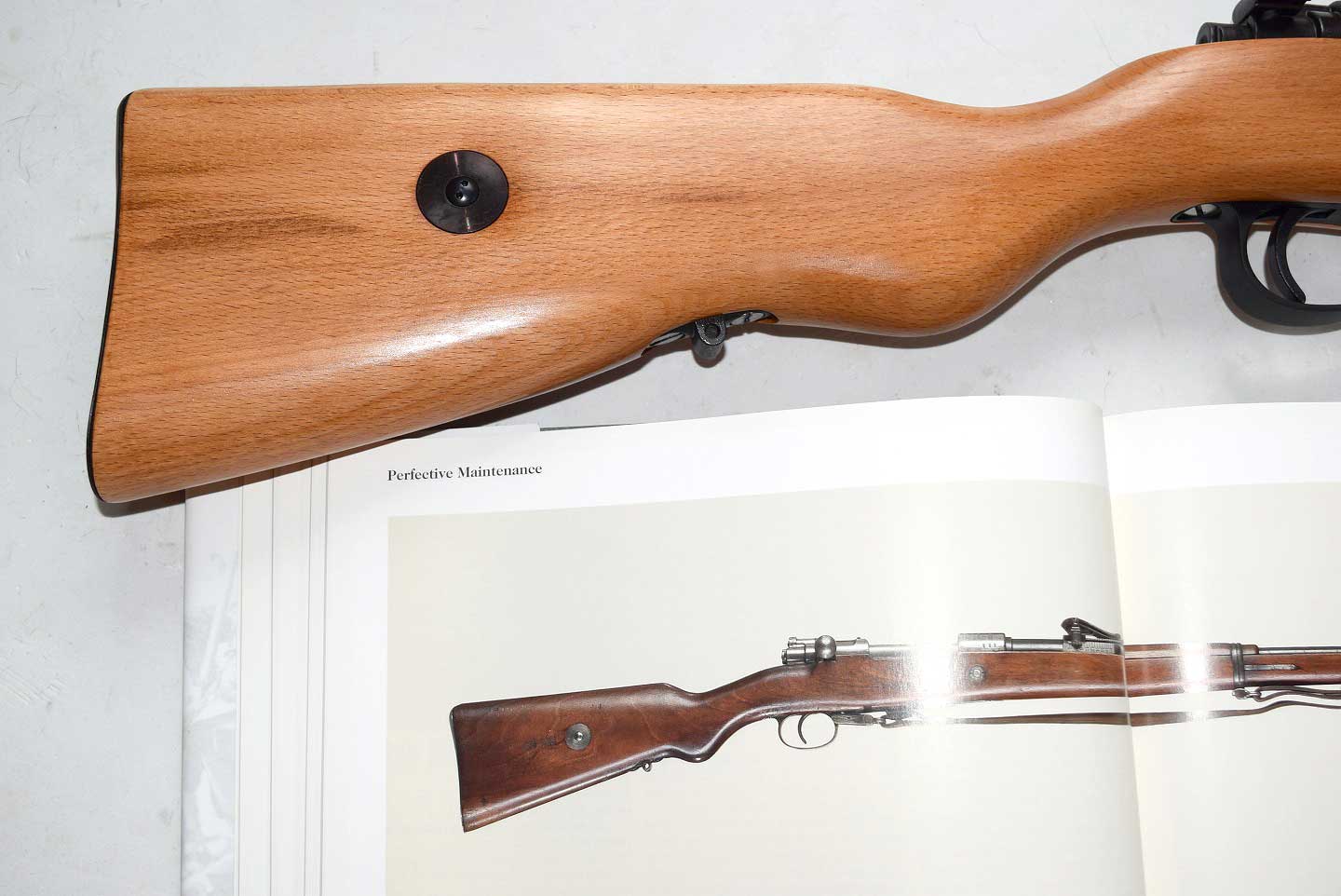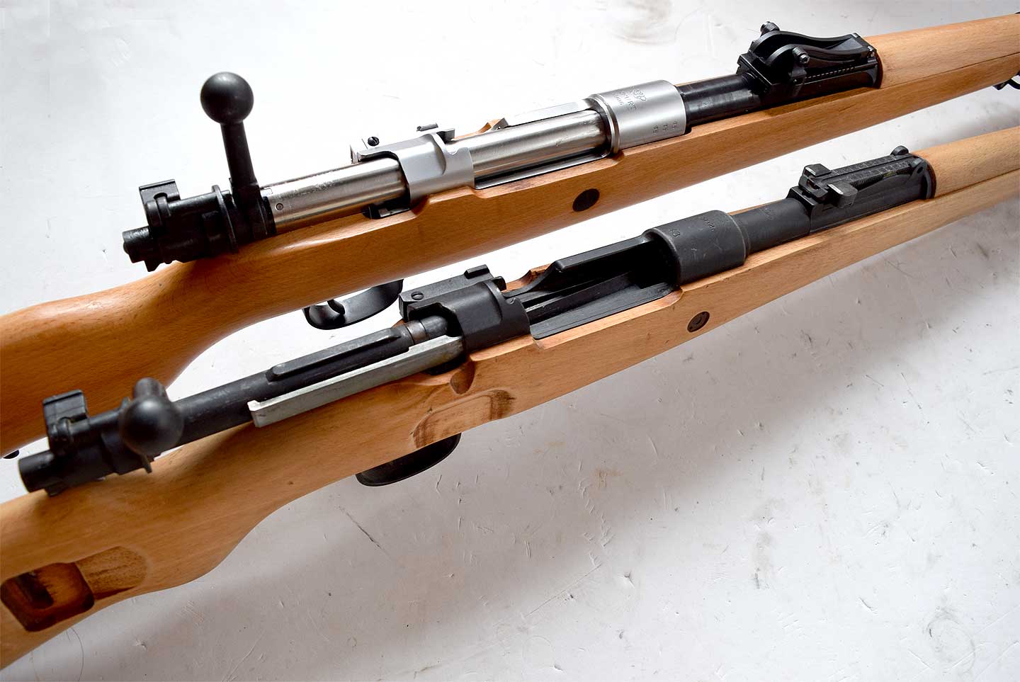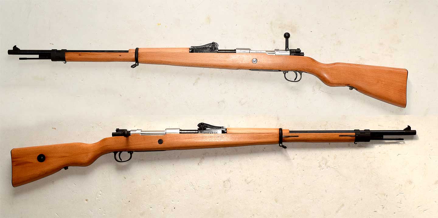 我が家のモーゼルKar98たちと比較しています。長さもですが、一般にカップ型のバットプレートしか流通していないのは、