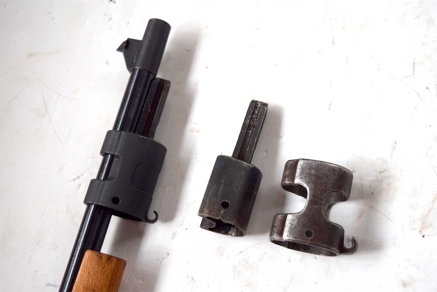 ストック先端部分の金具は、CMC モデルガンのように一体物になっています。実物は右のようにツーピースです。また、クリーニングロッドを外さなくても銃剣が入れられます。写真のすべて装着できました。装着しているのはウインドラスの模造刀で他は実物です。ツバがあるのはチェコ製です。