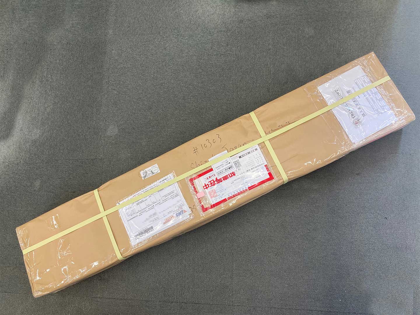 到着は日本郵便さんが持ってきました。税金で 7,300円を取られました。開封はされていないようです。表に弾速証明が貼られているのでOKなのかもしれません。中身の本体は、スポンジのような緩衝材にくるまれて横たわっています、これなら安心です。