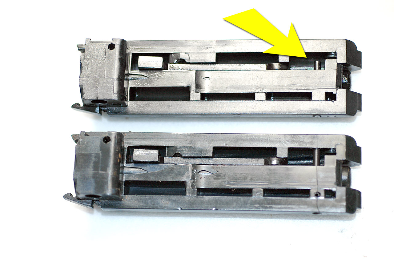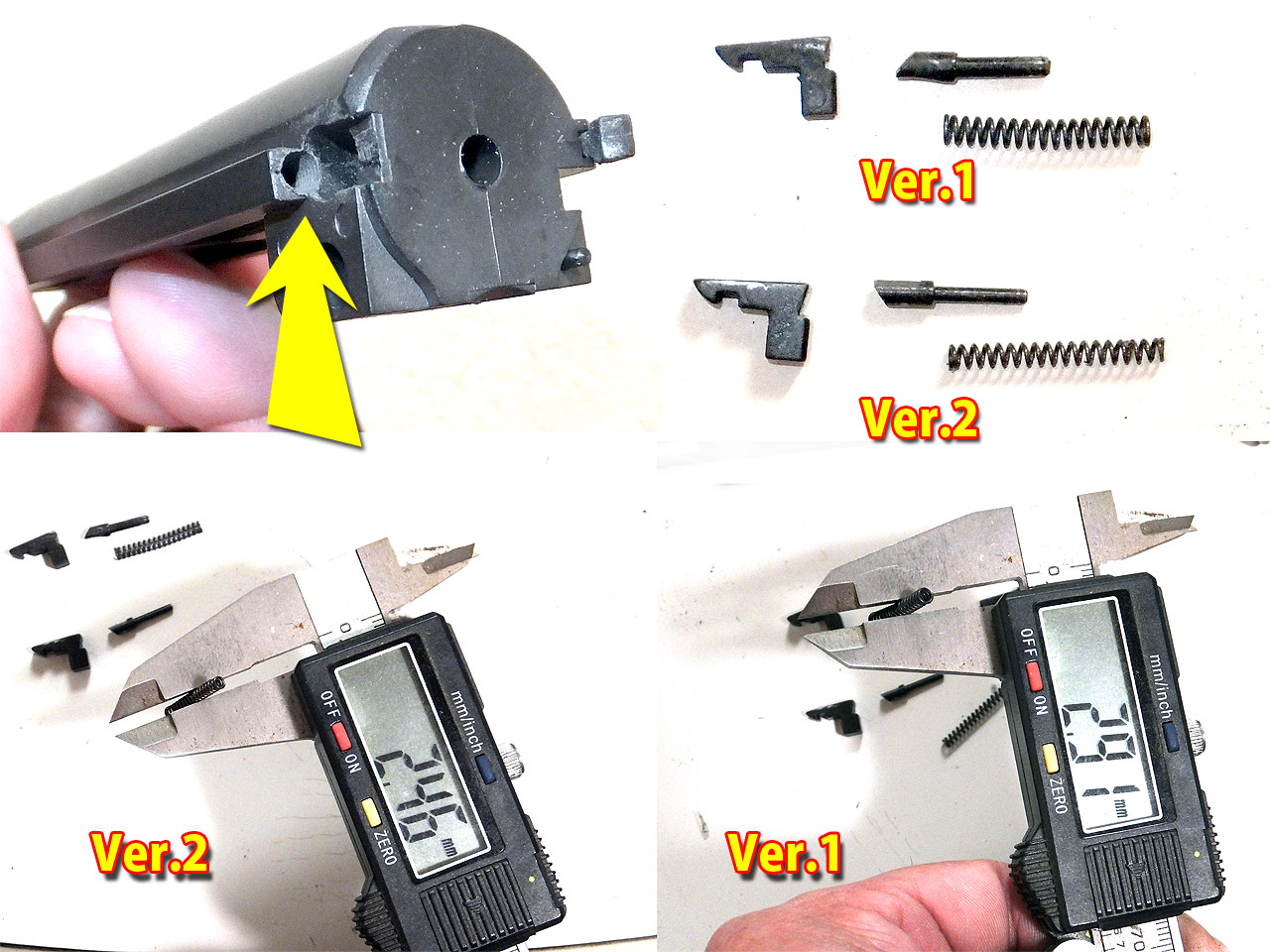 写真上がバージョン2で黄色矢印のように撃針止めピンが貫通していません。なお写真下のバージョン1のボルトは、そこに亀裂が入っています。