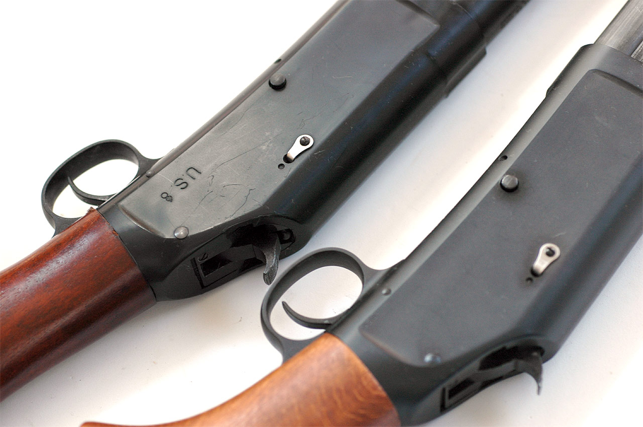 MGC のモデルガンは、形としてはテイクダウン型をコピーしたものでした。 形のコピーだけで実際にはモデルガンの銃身はバラせません。 タナカのトレンチガンは、ソリッドフレームのコピーです。下写真の一番上がMGC 製です。すこし小さく作られているように思います。