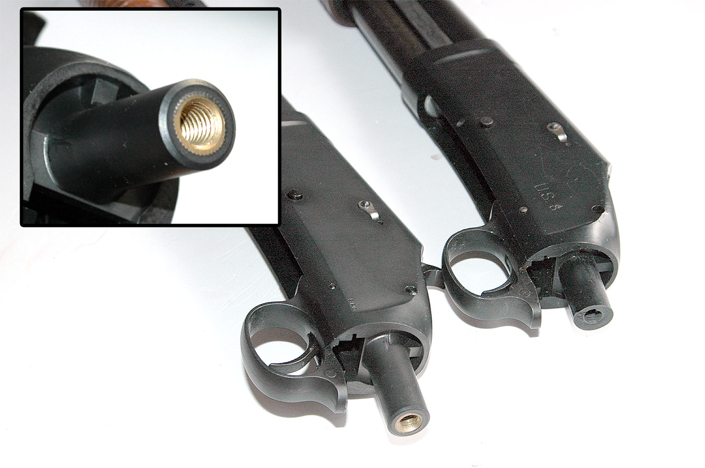 図のように実物は、バレルにボルトが少しかかっていますので、バレルにもネジがかかる切り込みが3カ所存在します。 しかしタナカのモデルガンには切込みは、ありません。
