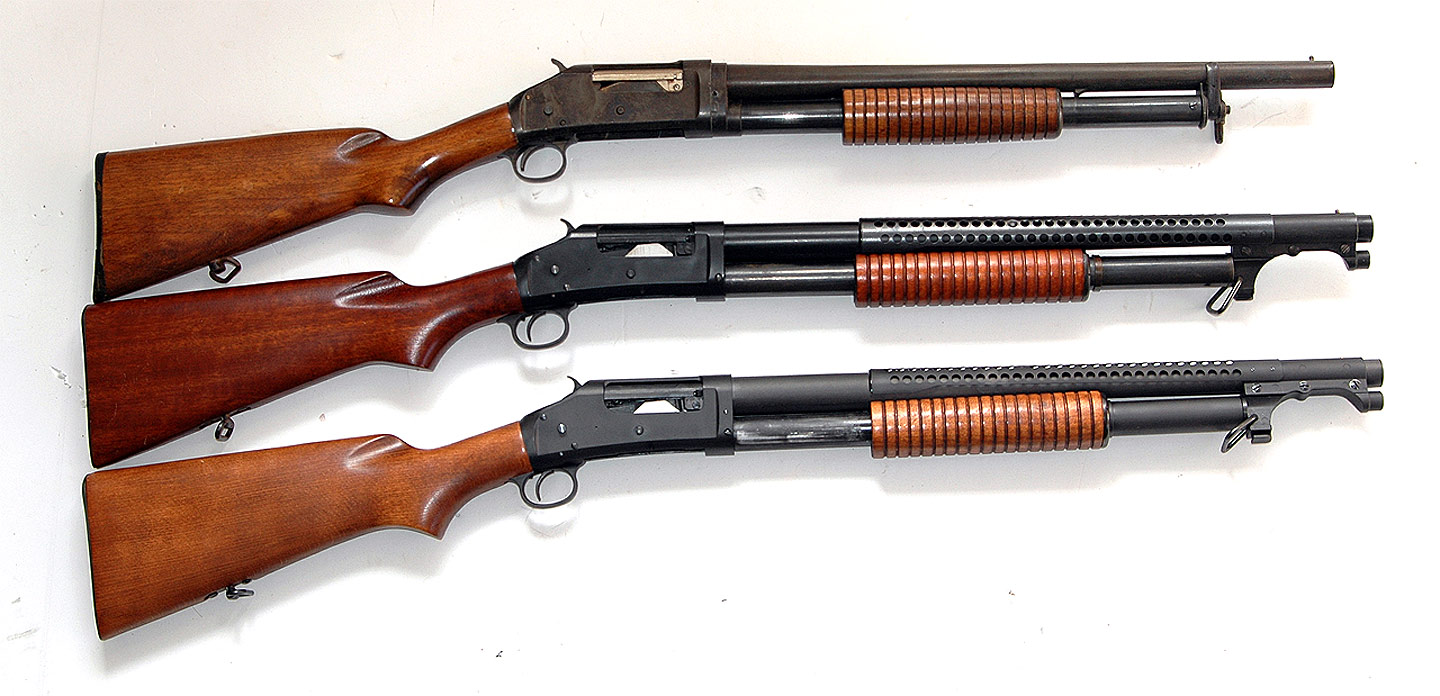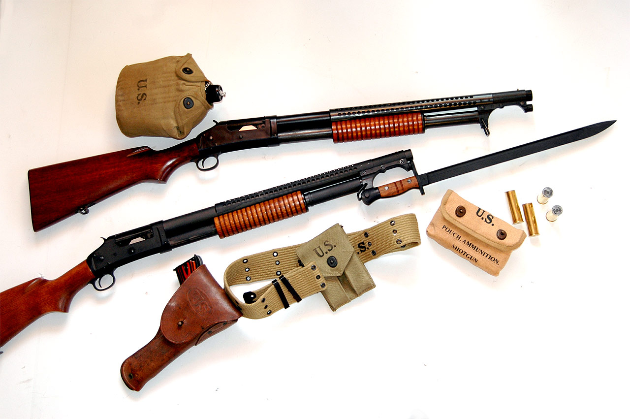 1897ショットガンは、通常30インチバレルのものが多いのですが、ライオットとトレンチガンは20インチバレルです。ソリッドフレームと銃身がバラせるテイクダウン型が存在し、登場から60年間に渡って製造され100万丁以上販売された