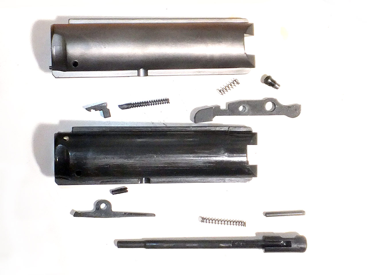 ところが、ここが入りません。エキストラクタのプランジャの穴が新型は小さいのです。ここは、レールが切れてしまうトラブルが発生したカ所なので、穴の径を小さくして対処したようです。と、いうことで新たにボルト部品を頼む人は、プランジャとスプリングも頼んだ方が楽です。