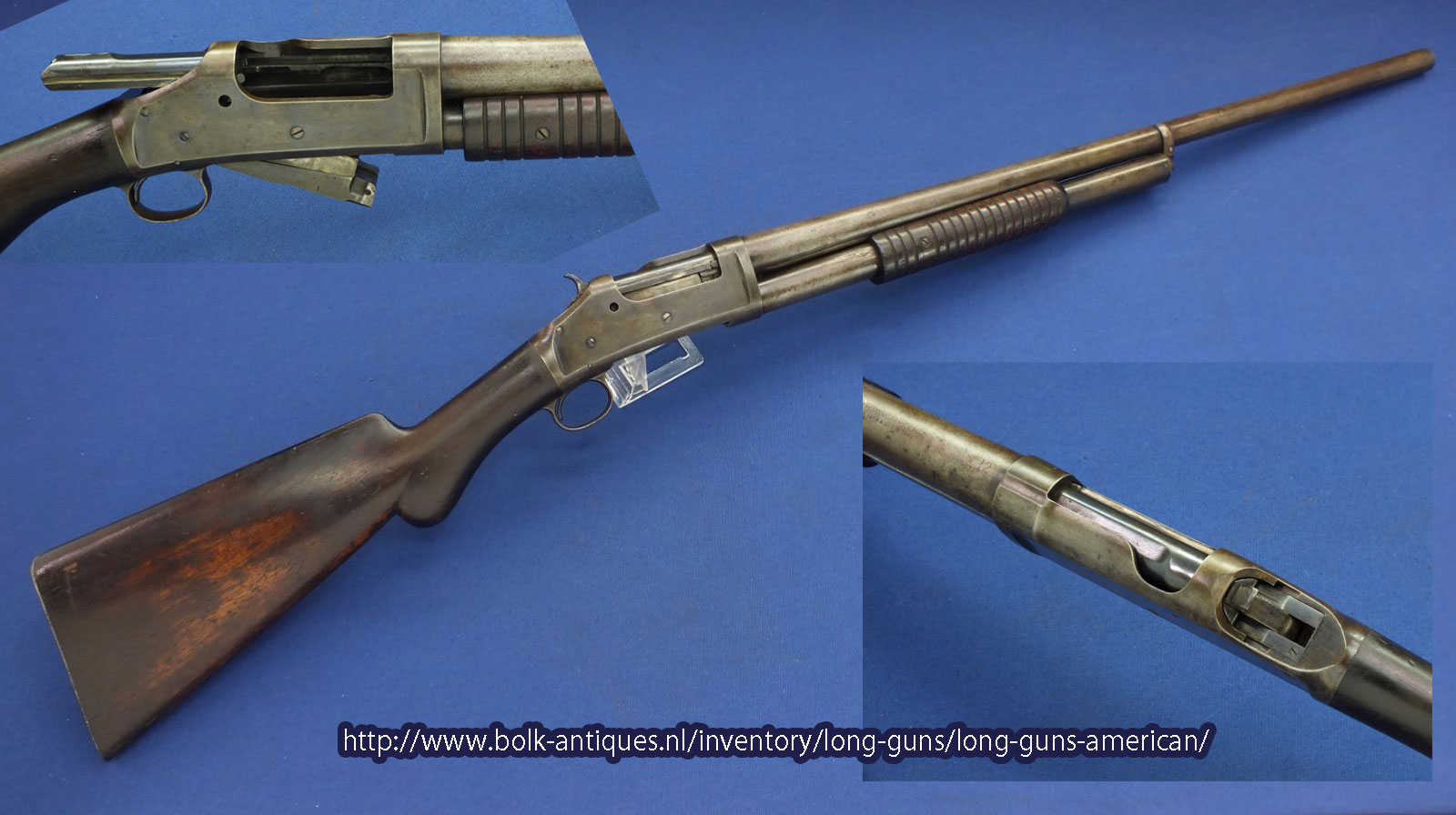 ウインチェスター97は、ジョン・ブローニングが設計した1893の改良型です。黒色火薬専用であったモデル93をフレーム上部のエグレを無くし、横向きに排莢することで強度を増して 無煙火薬もOK にしたものでした。