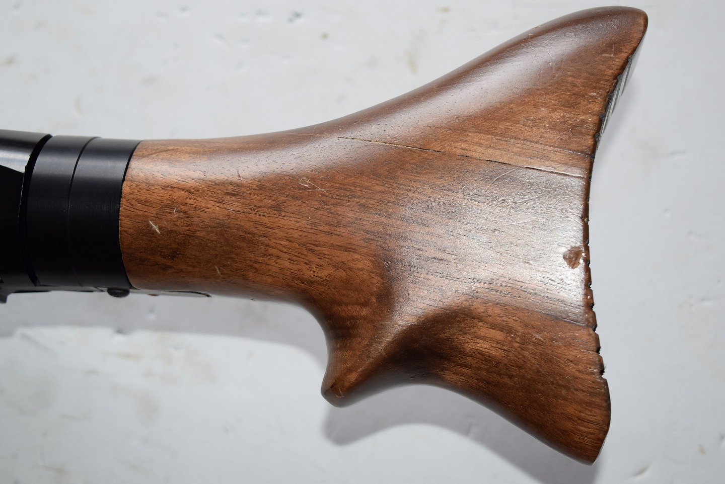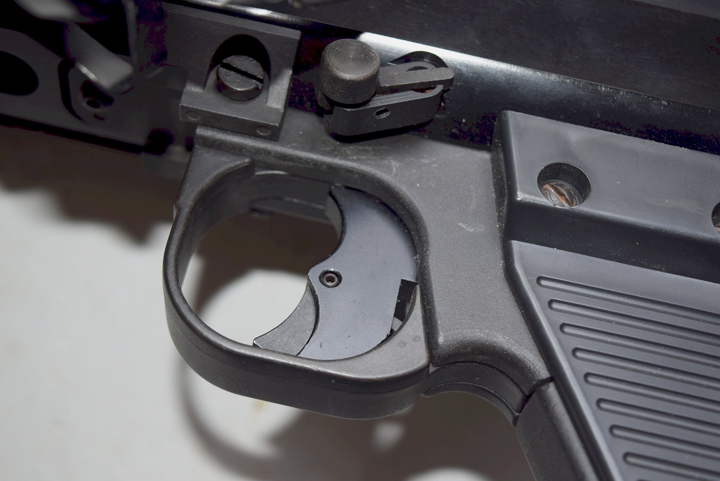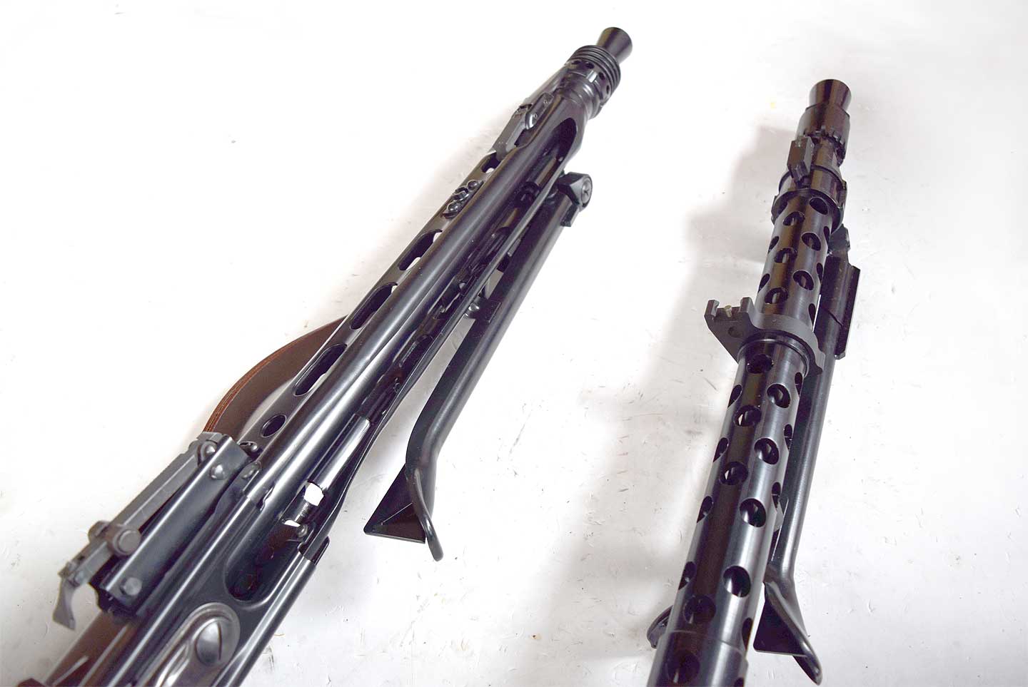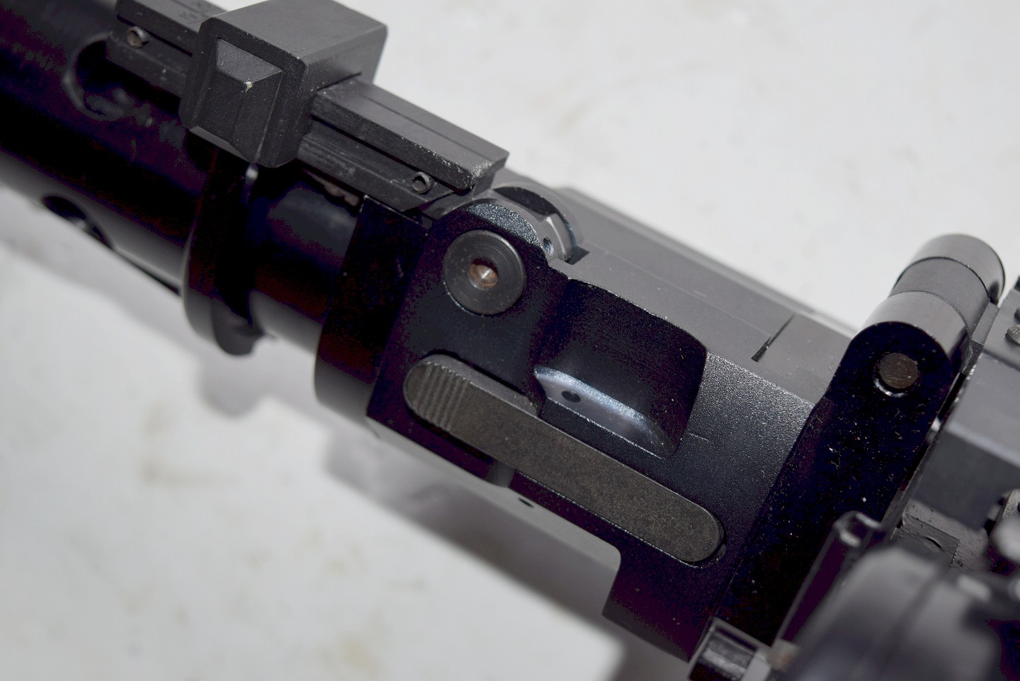 残念ながらトリガーやセフティの刻印はありません。バレルワンタッチ取り換えのレバーを押すと、すこしバレルがグラつきますので 何とかしたら本物のようにバレルジャケット回転が実現するかもしれません。バイポッドは実物にあるロック機構は省略されています。この個体の木製バットストックは割れたものが接着されています。ほかのWEB サイトでも割れたストックは見かけていますので、RWA 製品には、そこそこの割合で存在するのかもしれません。