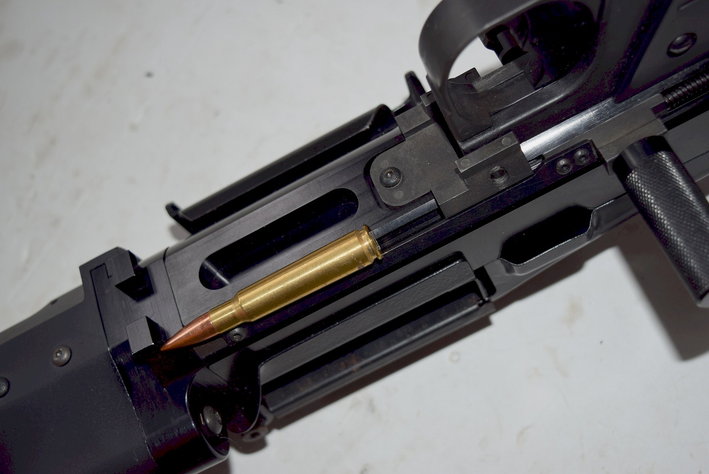 排莢孔にはフタがありません。また、写真のダミーカートのようにモーゼル弾の大きさではありません。NATO 弾ならOKかも?