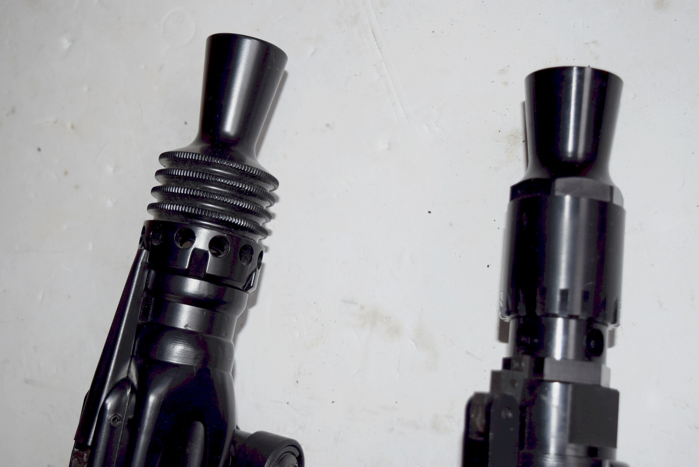 バレルジャケットが切削とプレスなので全然違っています。銃口回りは似ています。ドラムマガジンは、松栄に付いている 実物互換品はRWA には取り付けられませんでした。RWA の方が少し大きいようです。取り付けステーを少し曲げると 実物も取り付けられると思います。