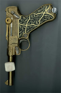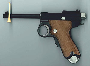そこで完全オリジナルで正確なイラストを描く方法を考えついた。 最近のコピー機はスキャン機能が付いている。 そこでモデルガンを置いて始めるのだが、ここで注意する事は水平になっているかを 確認する事である。 特に左右が対称でないルガーやランヤードの出ているP-38 などは特に注意。 また、ガバメントのように単純な形は横向きにおいても良いが P-08 のように入り組んだものは縦置きにしないと正確にトレースできない。 |