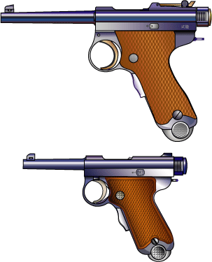↑A4ヨコの生データをサイズ縮小したもの。少し下から撮られている。 本物の生データは馬鹿でかいので注意。 ガバメントのスキャンは暗かったのでPhotoshop で明るくしているが、 ルガーのほうは、いじっていない。消しゴムで高さ調整。