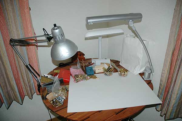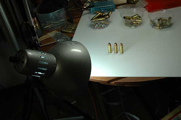 薬莢を水平に置いて上からライトを当てるとケースに光のラインが入って格好良く撮影できる。 しかし、寝かせて撮るのは、あまり格好良くないので立てて撮影することが多い。 ところが立てるとケースに光のラインが発生しないので面白くない。 そういう時は、下のほうから光を当ててやると感じよくラインが出る。 自在アームのライトは便利だ。 ↓上の写真の撮影風景